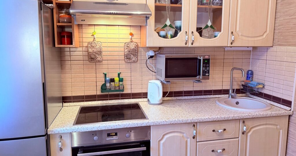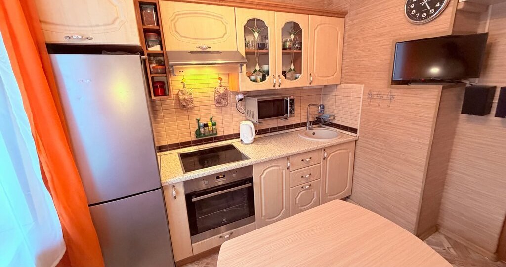 Техника (телевизор в комнате и в кухне холодильник, стиральная машина,духовка варочная панель, вытяжка, чайник( посуда )