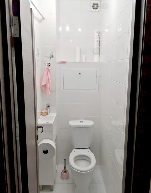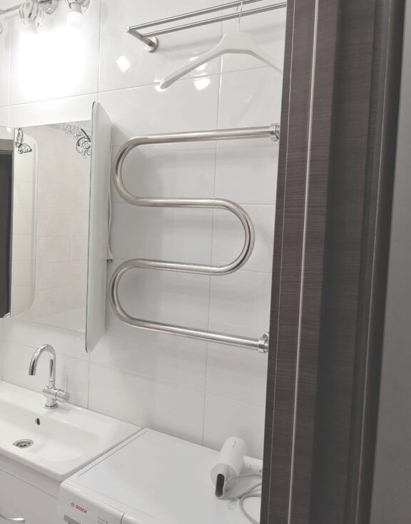 Дизайн продуман под максимальный функционал и минимум усилий по уборке. Полы - на одном уровне. Трубы отопления врезаны в стену, не в пол.