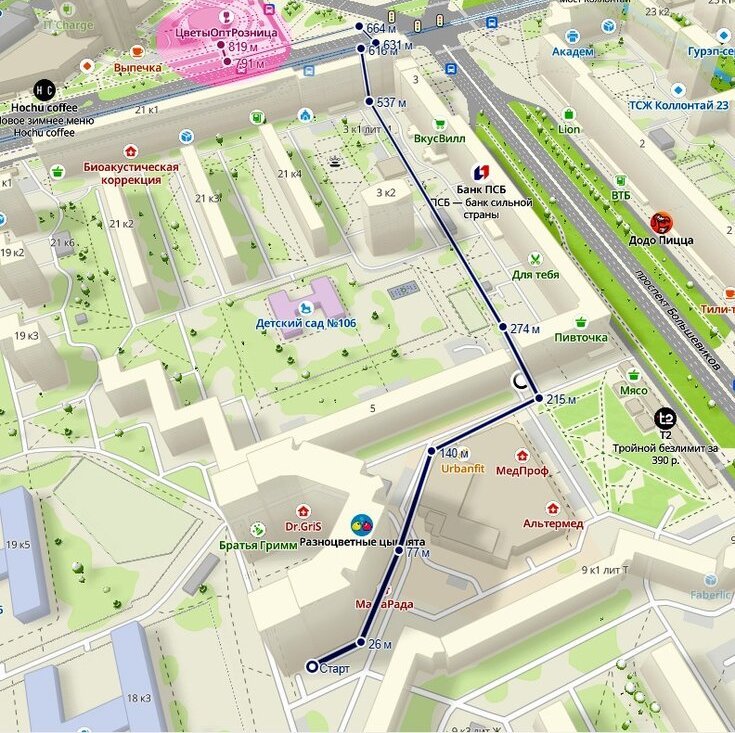 В этом же квартальном блоке - поликлиника N100, Почта России, стоматологи и лаборатории анализов.