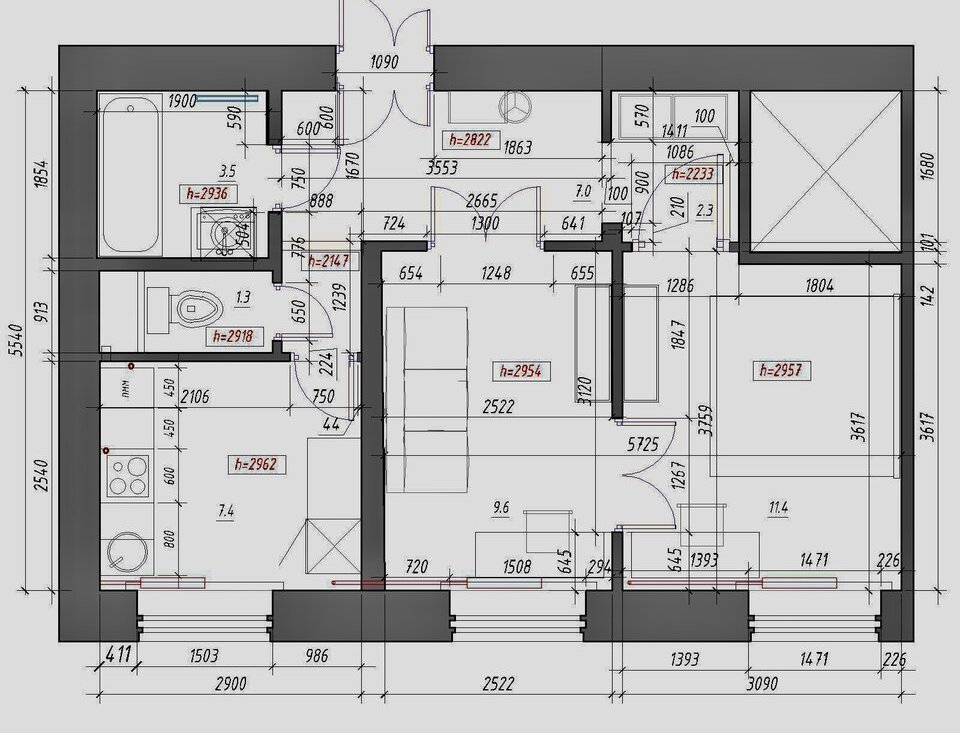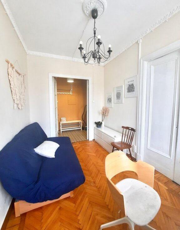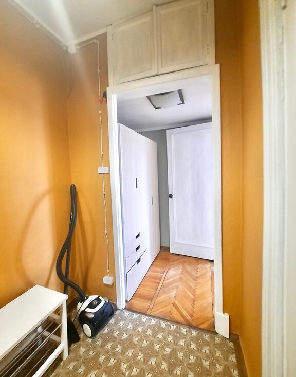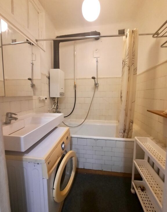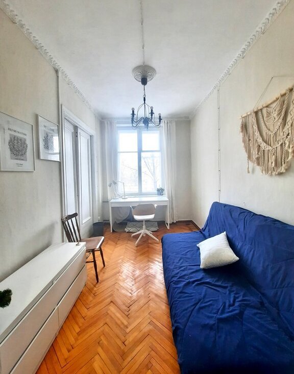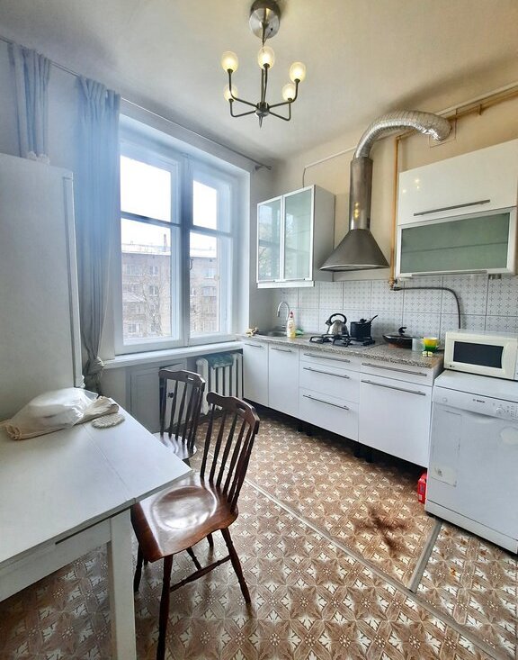 общ.S 45,5 кв.м., комнаты смежно-изолированные правильной формы (11, 4+9,6) кв. м., кухня 7,4 кв. м., раздельный санузел в советском кафеле. Светлая квартира с деревянными окнами с видом во двор. Без балкона, но имеется ниша в коридоре с полноценным шкафом.