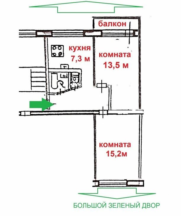 Квартира с отличной планировкой: двусторонняя с равноценными комнатами, довольно большая прихожая, балкон. Окна одной комнаты выходят в большой зеленый тихий двор, вторя комната и кухня - на пр. Науки: красивый вид, окон напротив нет. Между проезжей магистралью и домом широкий газон с деревьями.