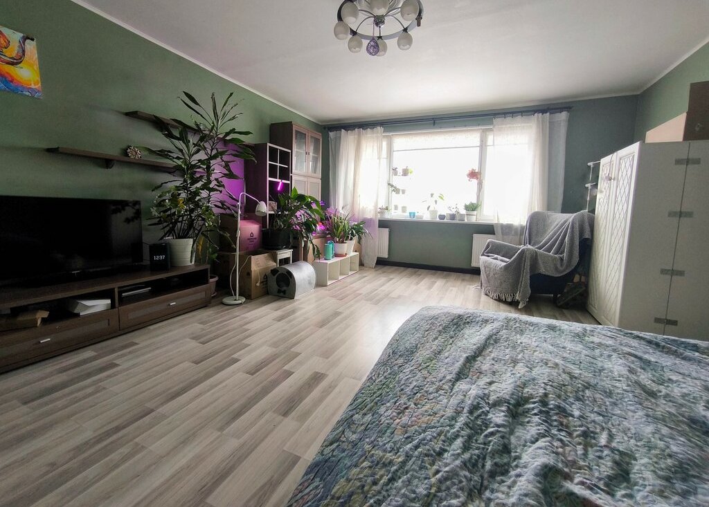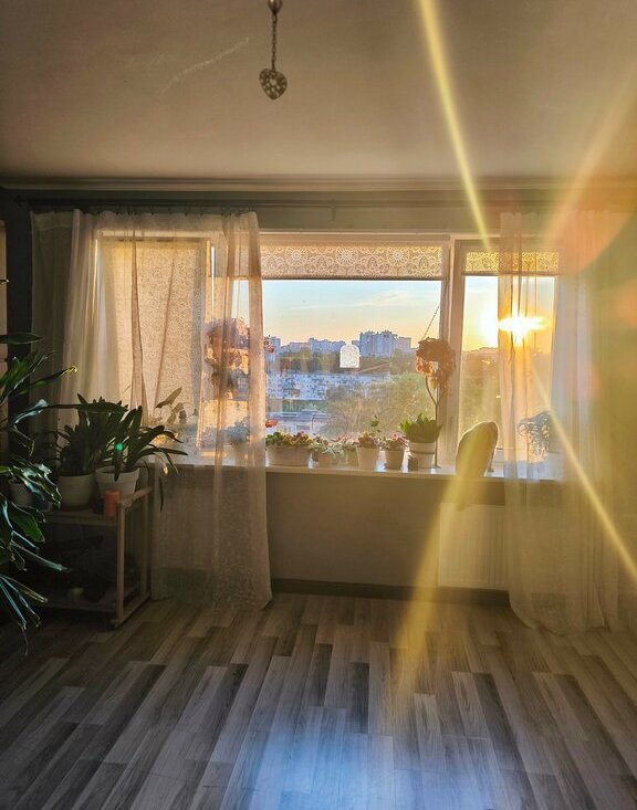 Первая комната - 25,4 м2 с огромным видовым окном на город и сад Жореса Алферова и закатами.