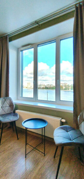 Квартира имеет шикарный вид на Неву, любоваться которым вы сможете как во время рабочего дня из гостиной, так и из кухни во время приятного ужина, обеда и завтрака. Выпить чашечку кофе, любуясь отплывающими теплоходами с балкона, или наблюдать ночное разведение моста.