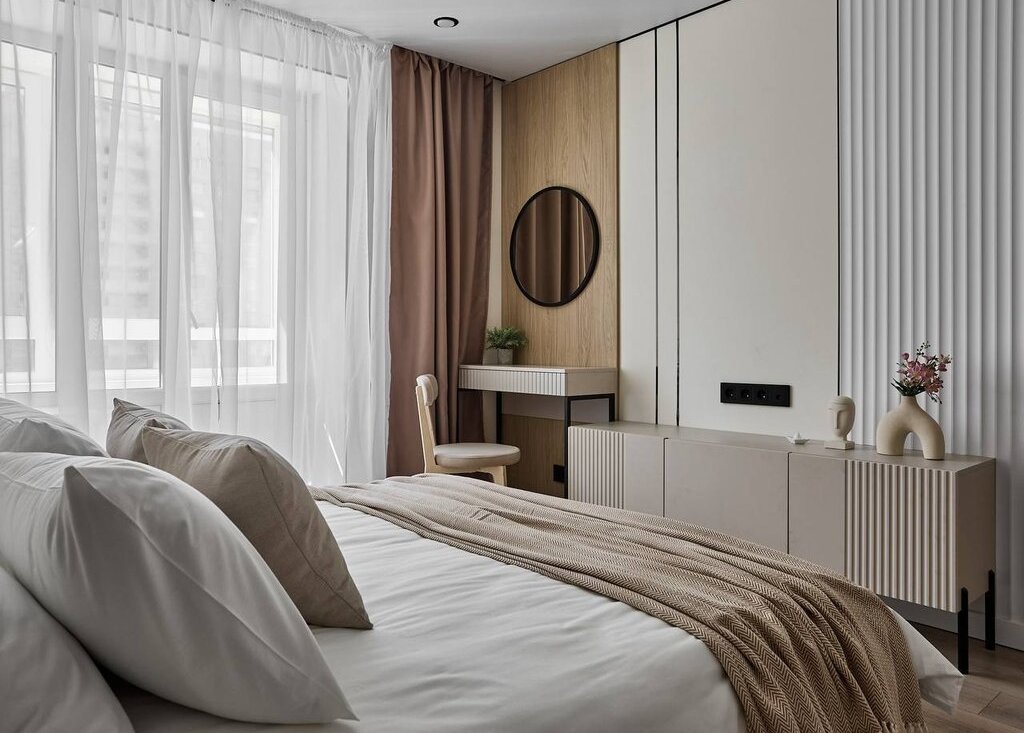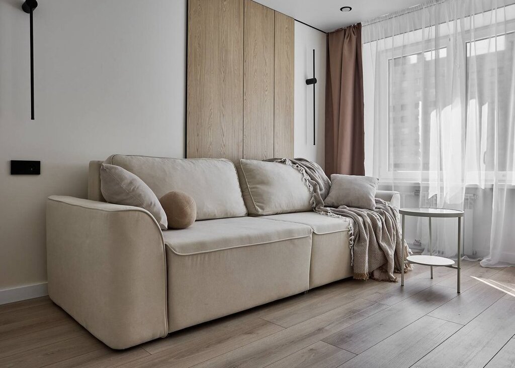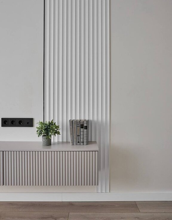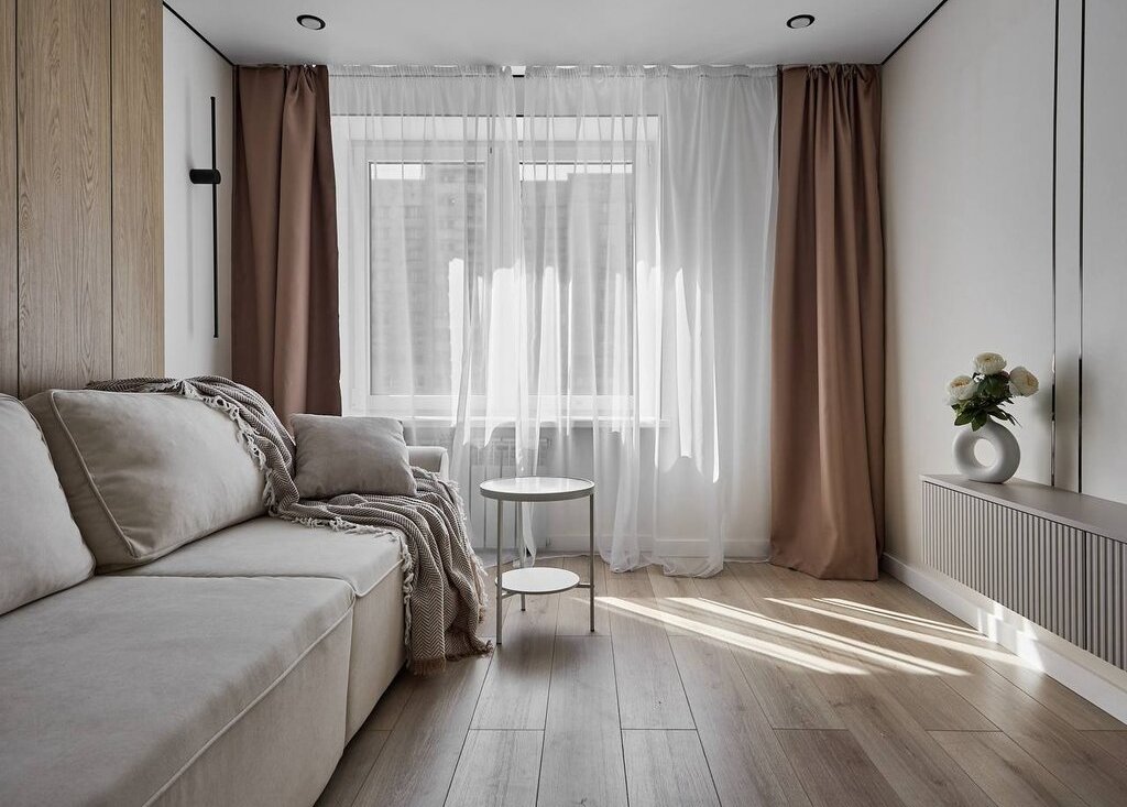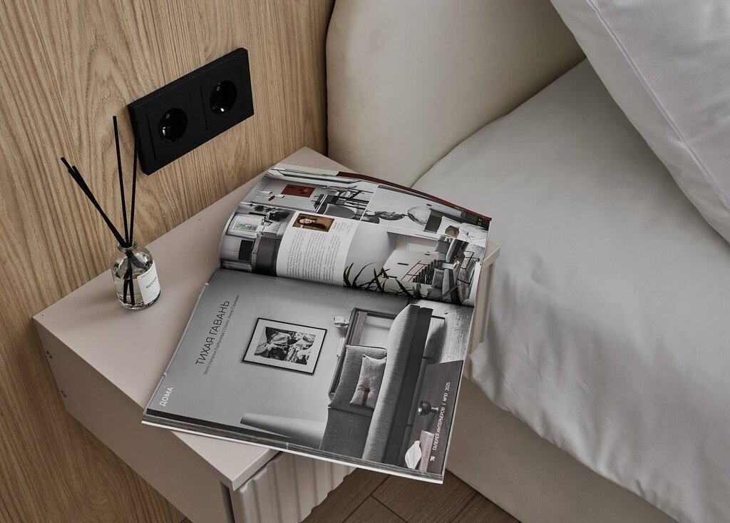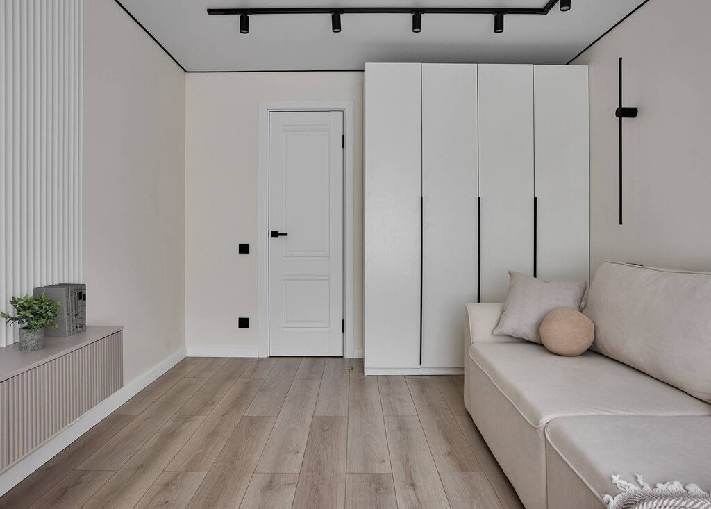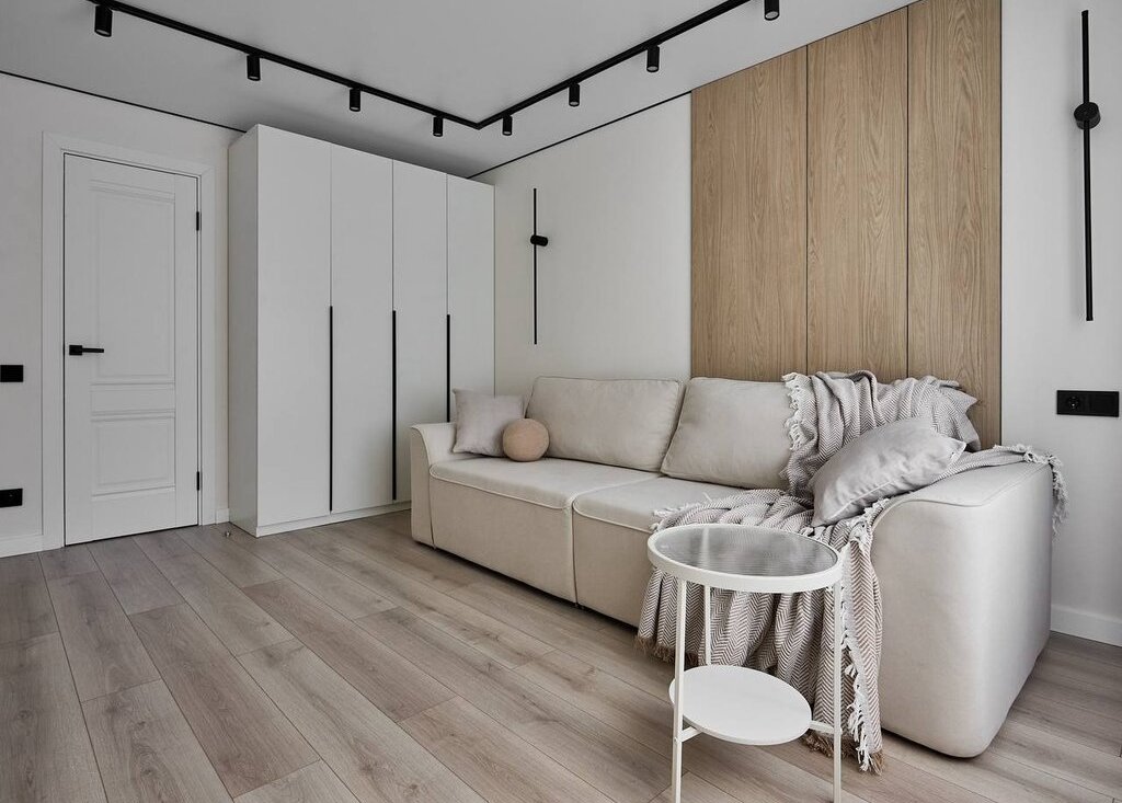 В квартире используются современные декоративные решения, ремонт выполнен в светлых тонах с акцентным светлым деревом.