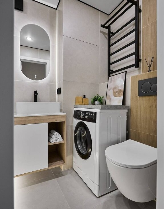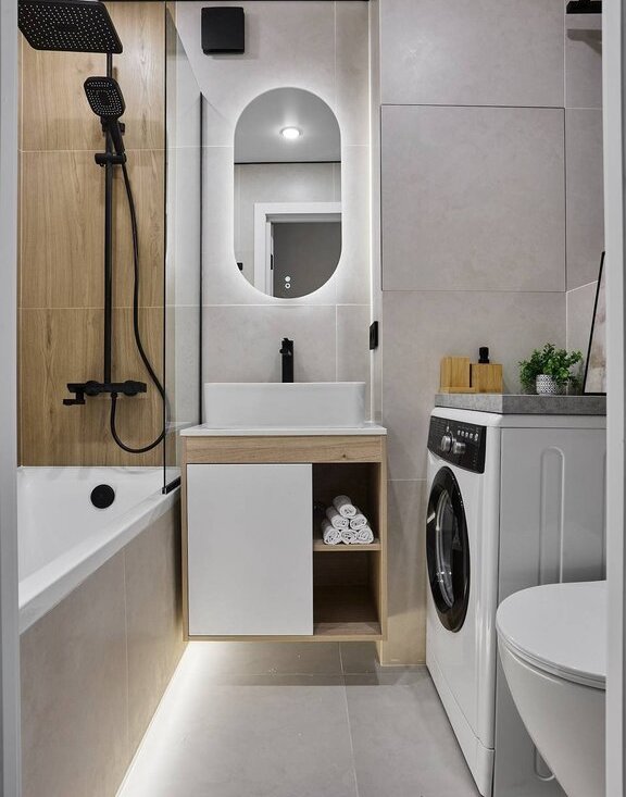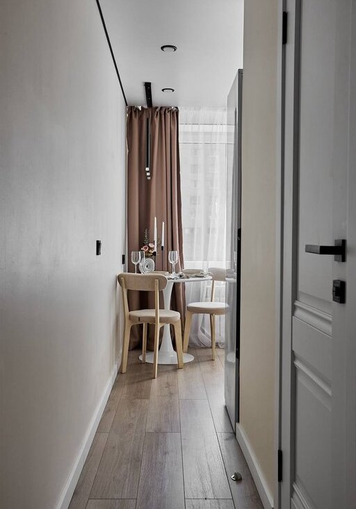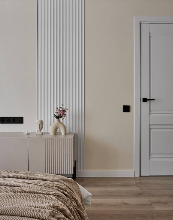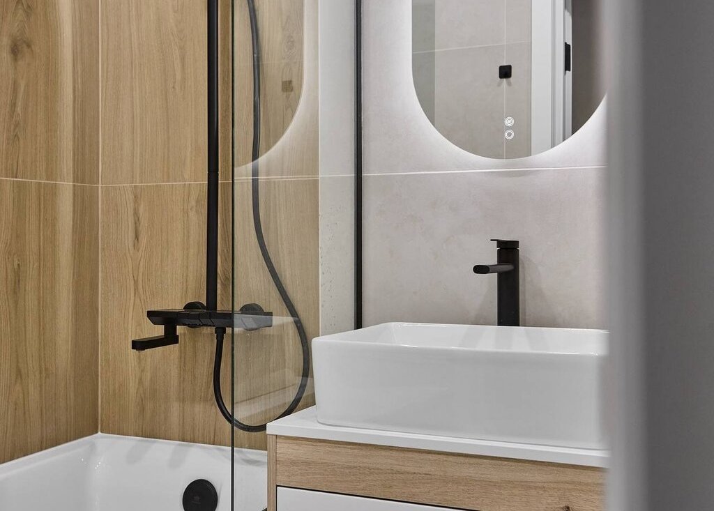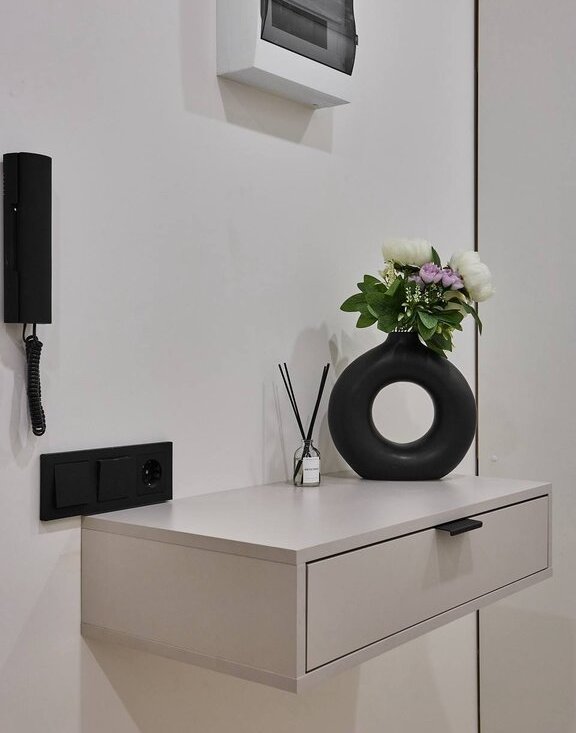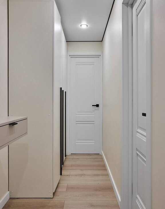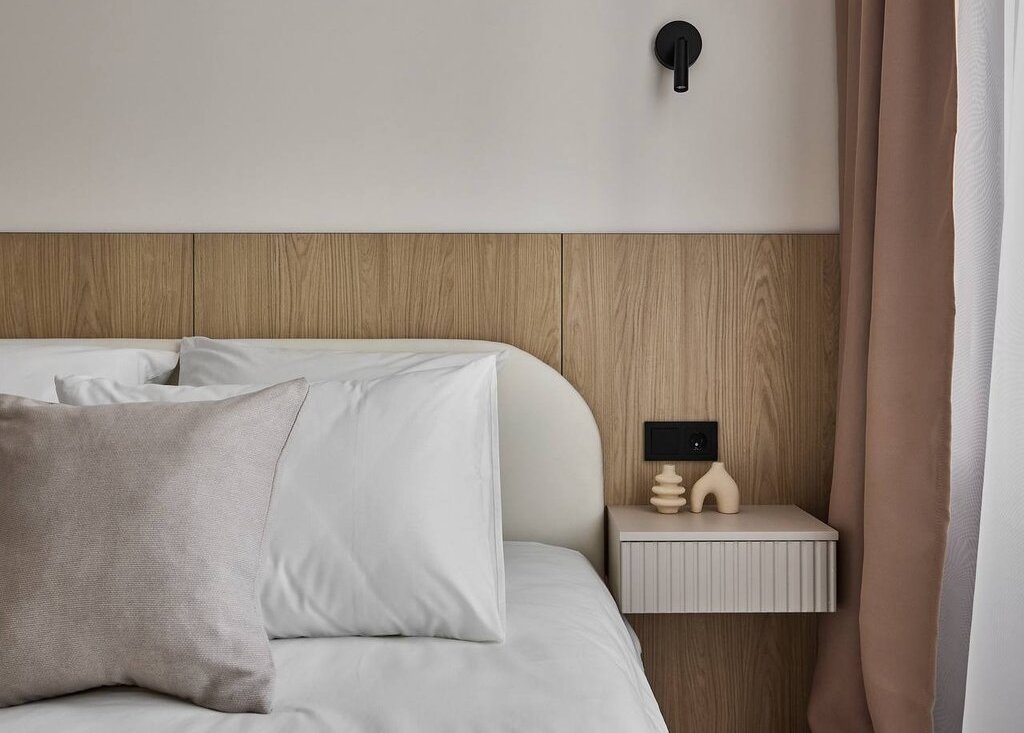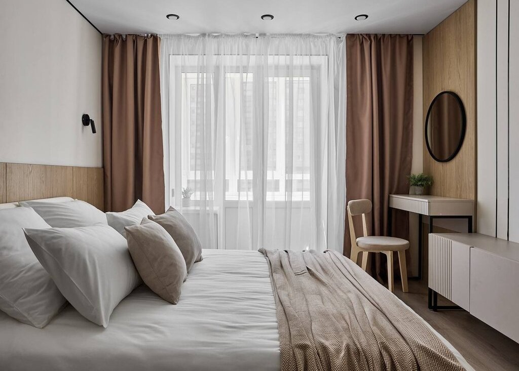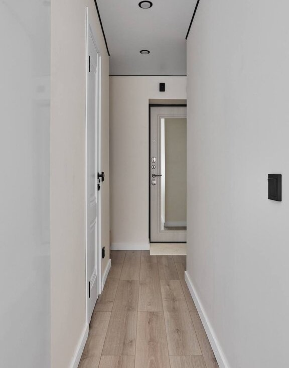В квартире используются современные декоративные решения, ремонт выполнен в светлых тонах с акцентным светлым деревом.