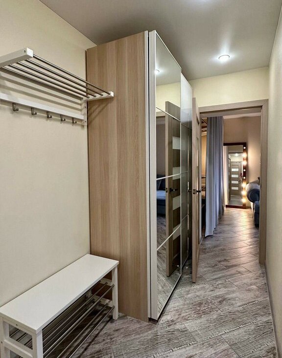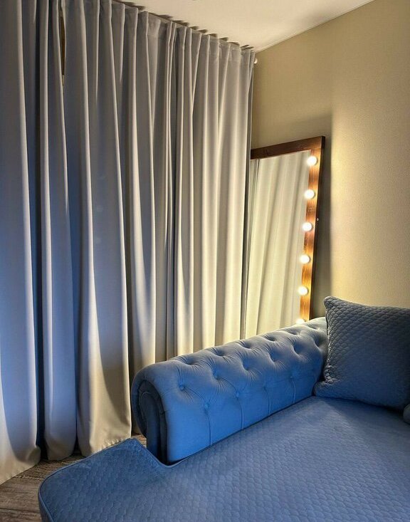 · Гостиная: Идеальное место для отдыха у большого плазменного ТВ на раскладном диване. В вашем распоряжении просторная гардеробная система во всю стену и стильное гримерное зеркало из массива дерева.