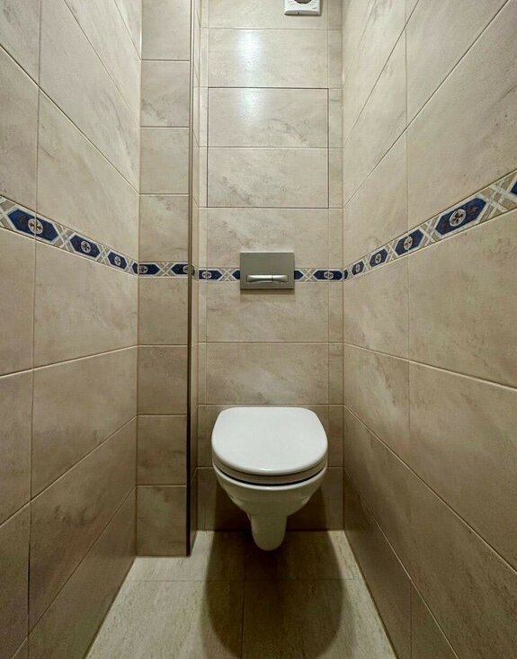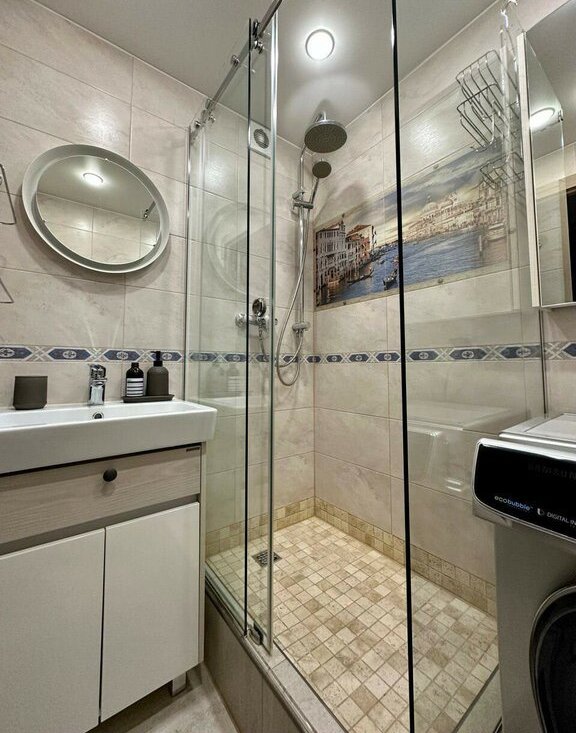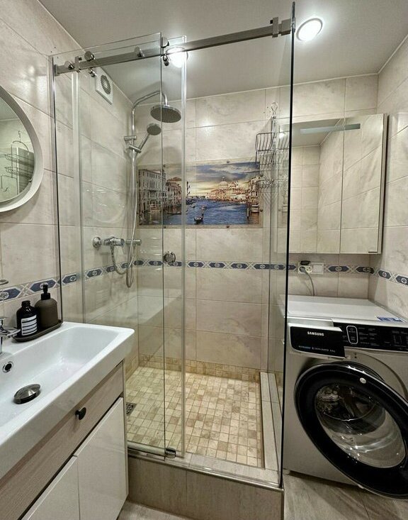 · Ванная комната: Раздельный санузел. В ванной — современная душевая кабина с раздвижными дверями и стиральная машина Samsung.