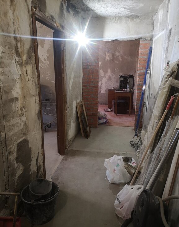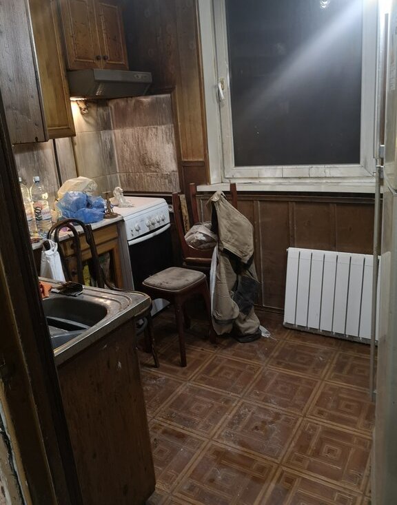 На кухне есть старая мебель и техника (холодильник, микроволновка, плита и телевизор). В ванной стиральная машина.