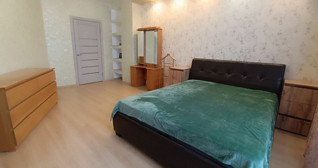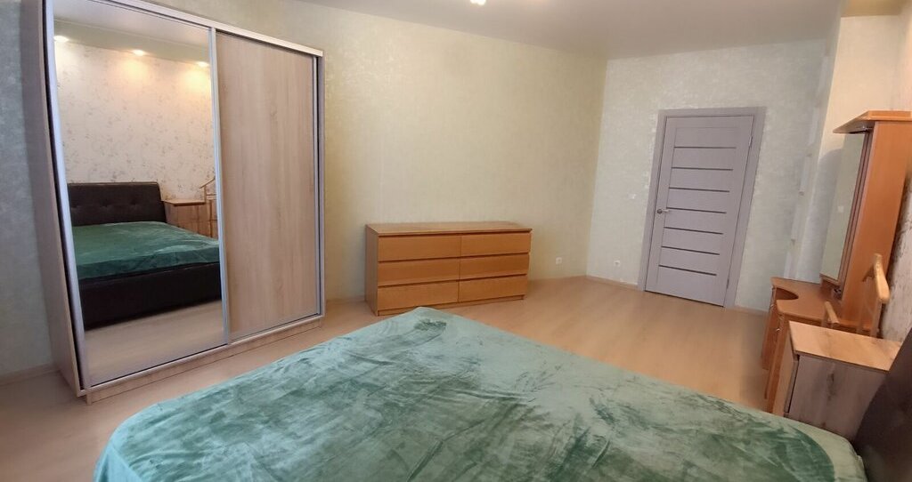 В спальне: большая 2-спальная кровать с абсолютно новым матрасом, прикроватные тумбы, вместительный шкаф-купе, комод, туалетный столик с зеркалом.