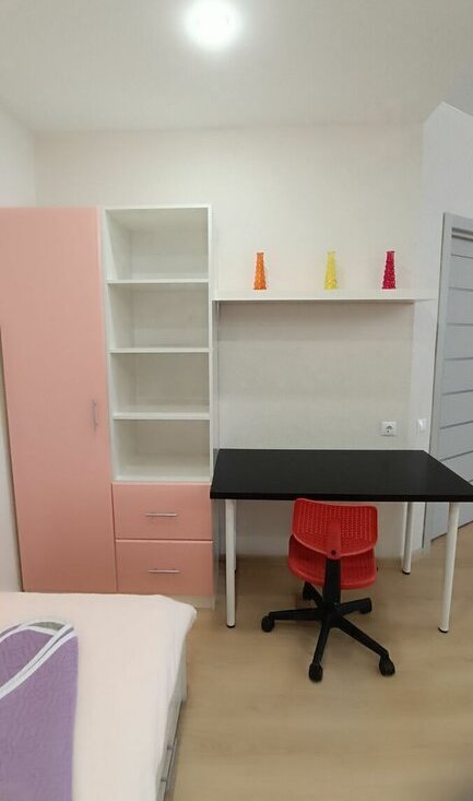 В комнате: диван (раскладывается в полноценное 2-спальное место), телевизор, а также удачно выделено зонированием личное пространство для ребенка с кроватью, шкафом, ученическим местом.