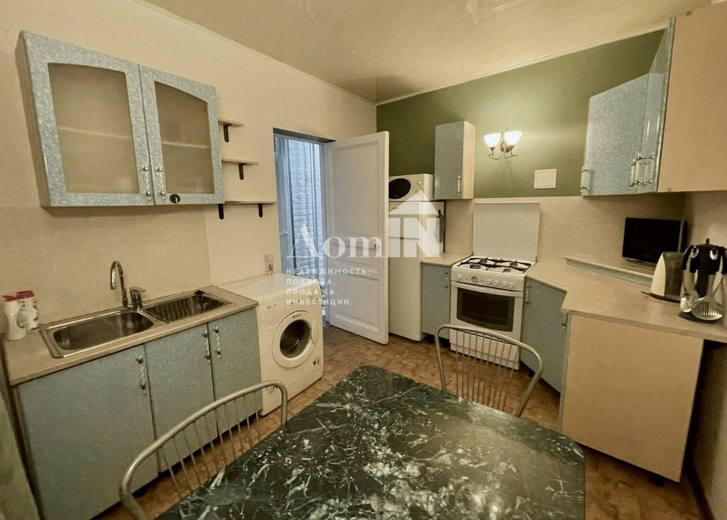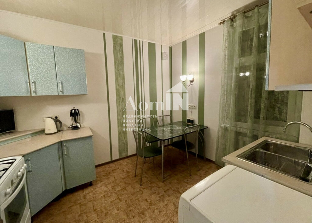 - Встроенная кухня с газовой плитой, духовкой, холодильником, микроволновкой, чайником, обеденным столом и стиральной машиной;