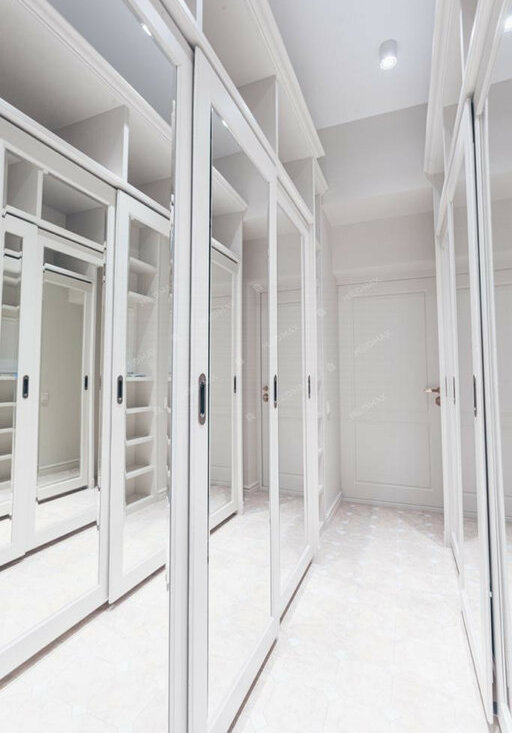 • Вместительную гардеробную комнату с множеством полок и мест для хранения.