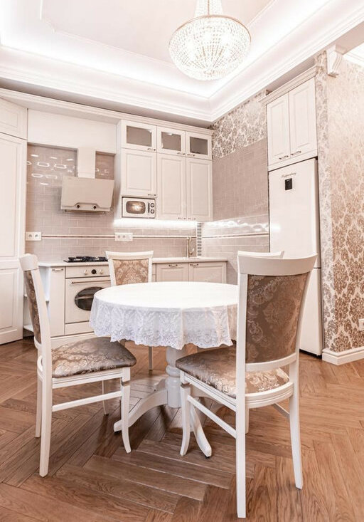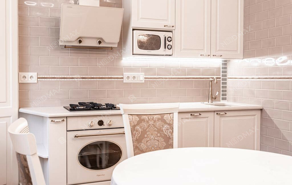 Квартира полностью укомплектована необходимой техникой: стиральная и посудомоечная машины, духовой шкаф, плита, холодильник, телевизор и кондиционер — все для вашего удобства!