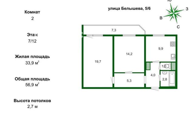 2-комнатная квартира: Санкт-Петербург, улица Белышева, 5/6 (56 м²)
