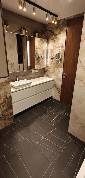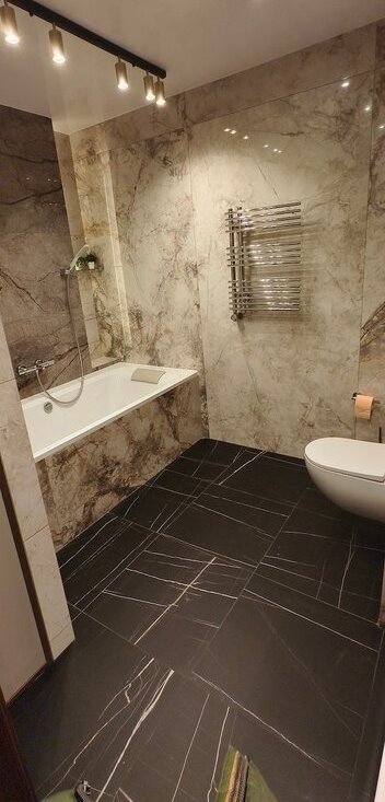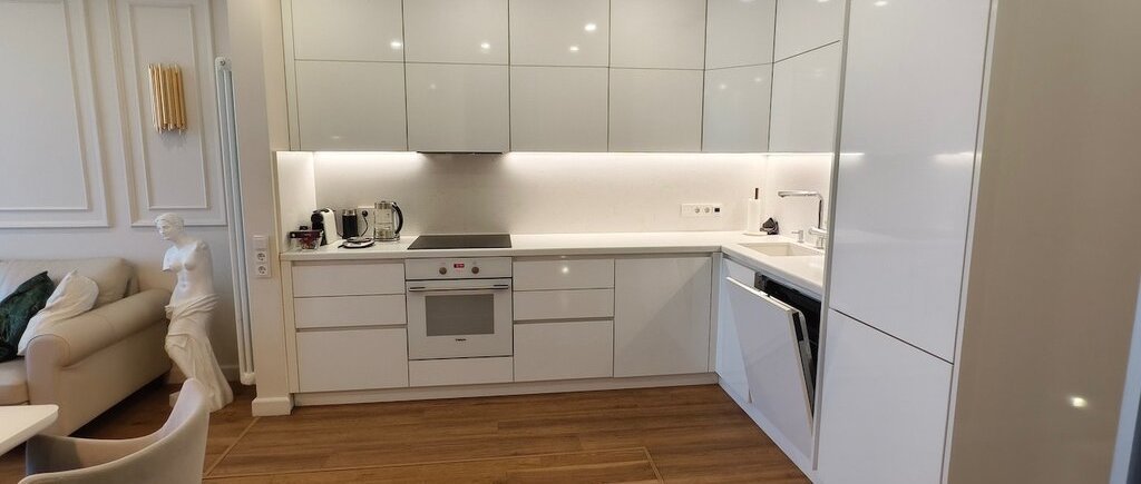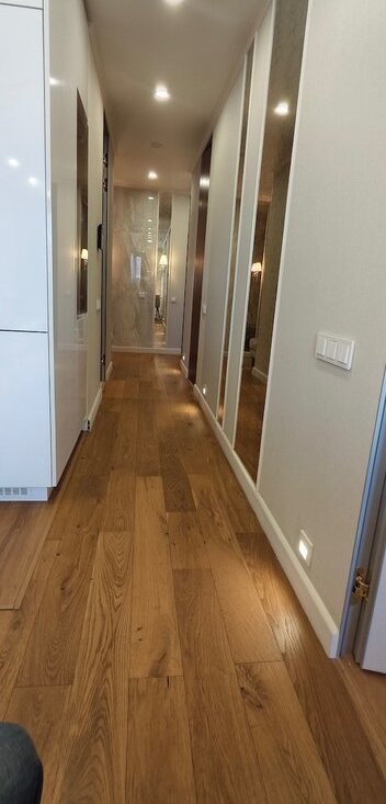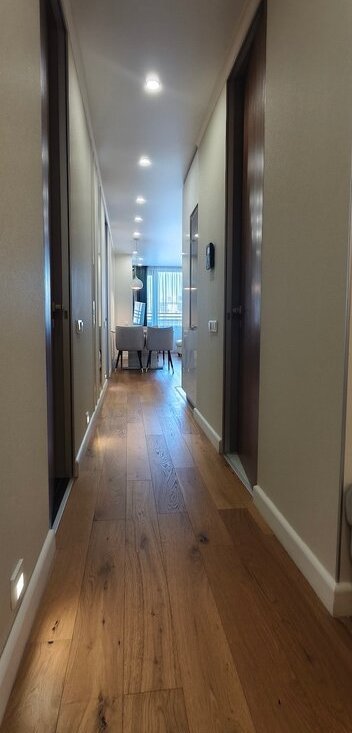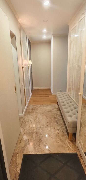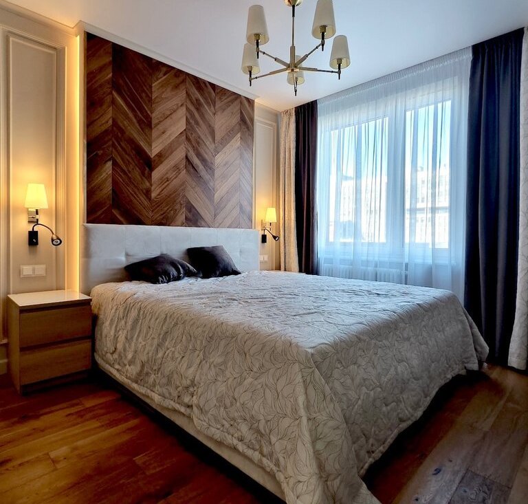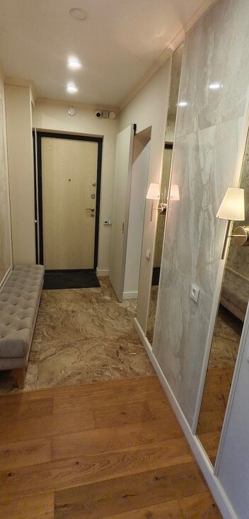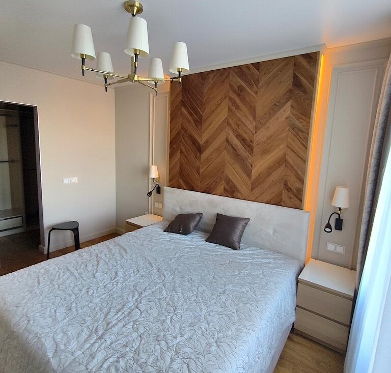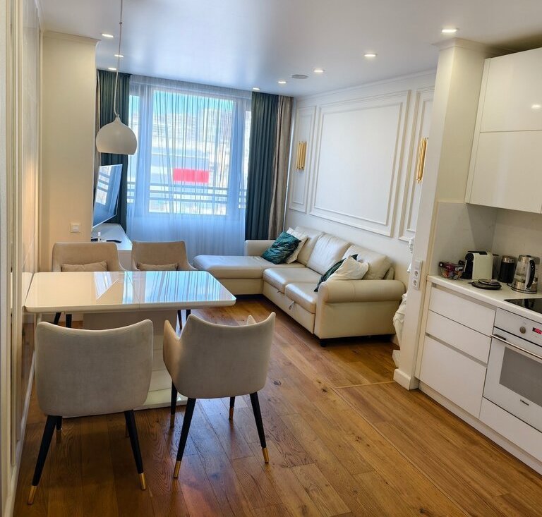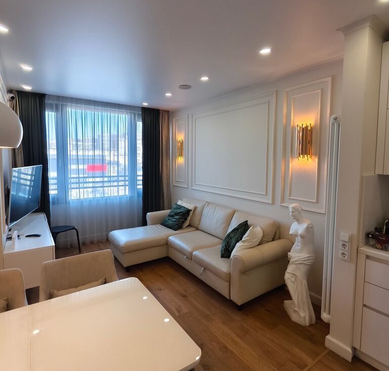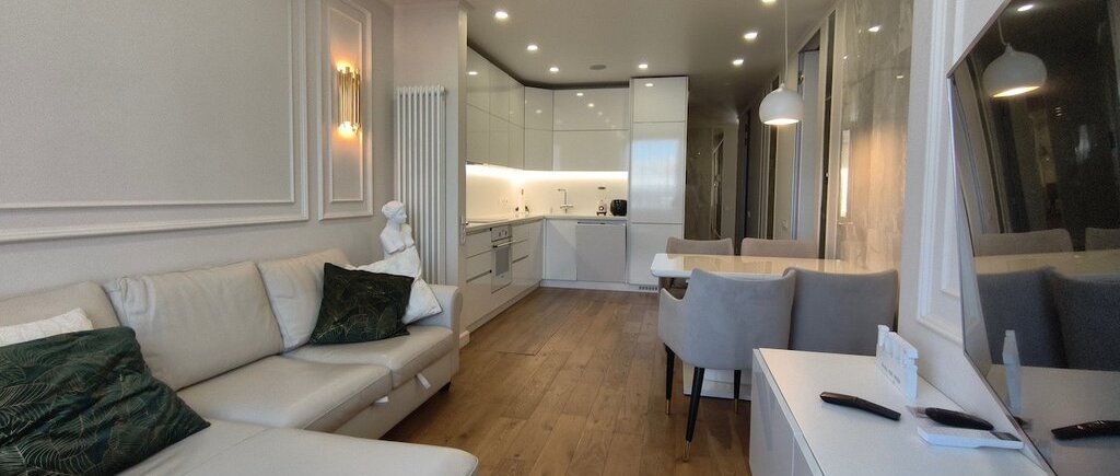 Квартира с дизайнерским ремонтом с двумя спальными и кухней гостинной.