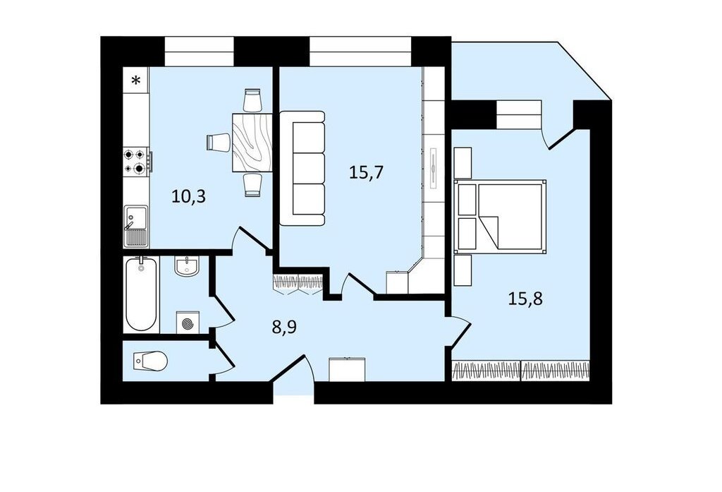 Две отдельных комнаты, большая кухня, раздельный санузел с ванной, коридор с местами хранения.