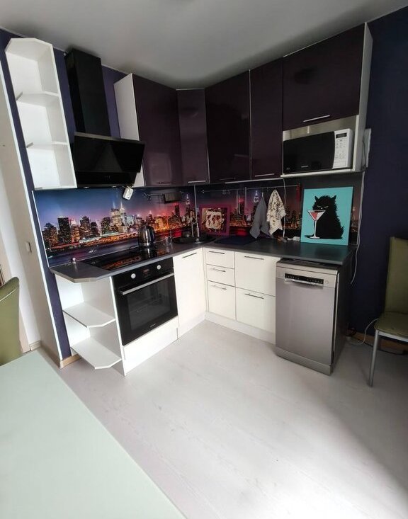 В квартире выполнен косметический ремонт. Комнаты изолированные, санузлы раздельные. Просторная кухня площадью 9 м² оснащена бытовой техникой, включая посудомоечную машину (отсутствует холодильник).