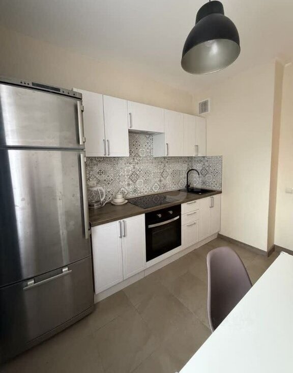 В квартире сделан косметический ремонт, есть вся необходимая мебель на кухне и в комнатах. Вся мебель новая. Из техники — холодильник, телевизор и стиральная машина