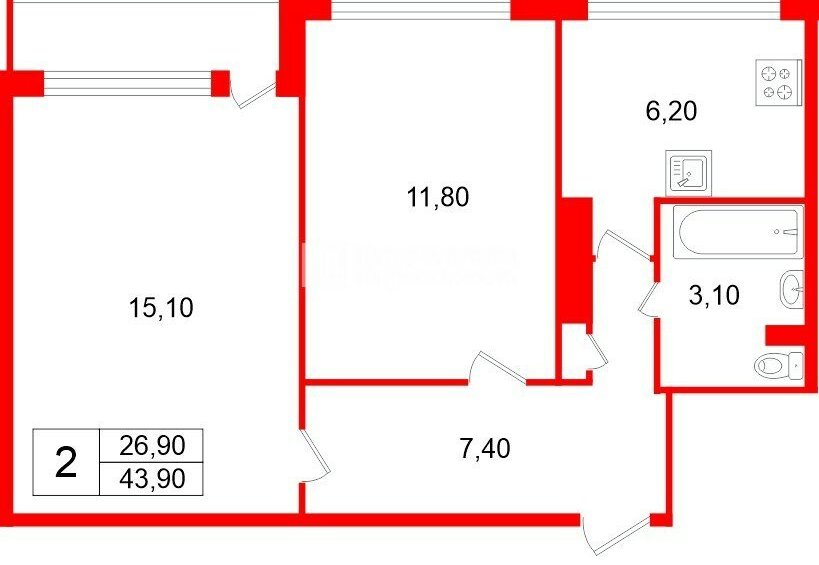 2-комнатная квартира: Санкт-Петербург, улица Рихарда Зорге, 12 (43.9 м²)