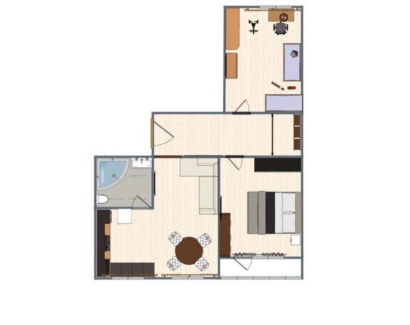 Простор для семьи: Большая кухня-гостиная площадью 22 м² — это сердце квартиры. Здесь можно собраться всем вместе за ужином, принять гостей или уютно провести вечер всей семьей на большом диване за просмотром любимых фильмов.