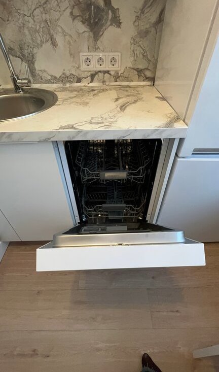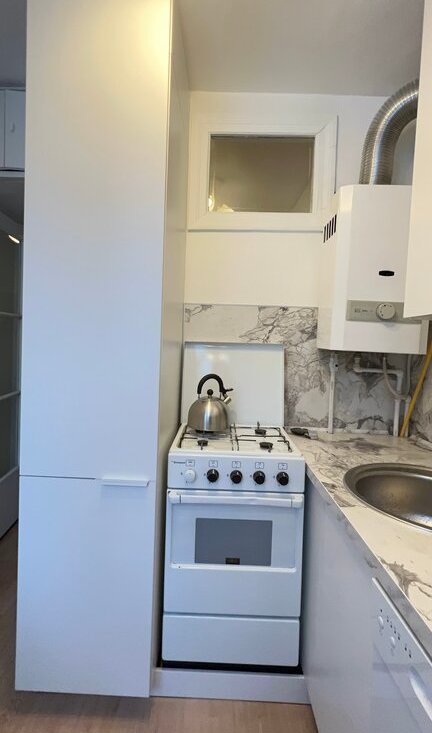 Кухня небольшая, но очень правильно спланирована, есть посудомоечная машинка и холодильник, много мест хранения. Газовая колонка залог горячей воды всегда!