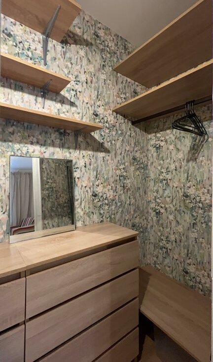 В спальне гардеробная, кресло, 2 тумбы и двухспальная кровать с подъемным механизмом.