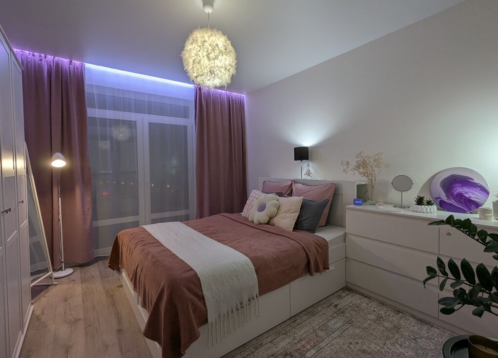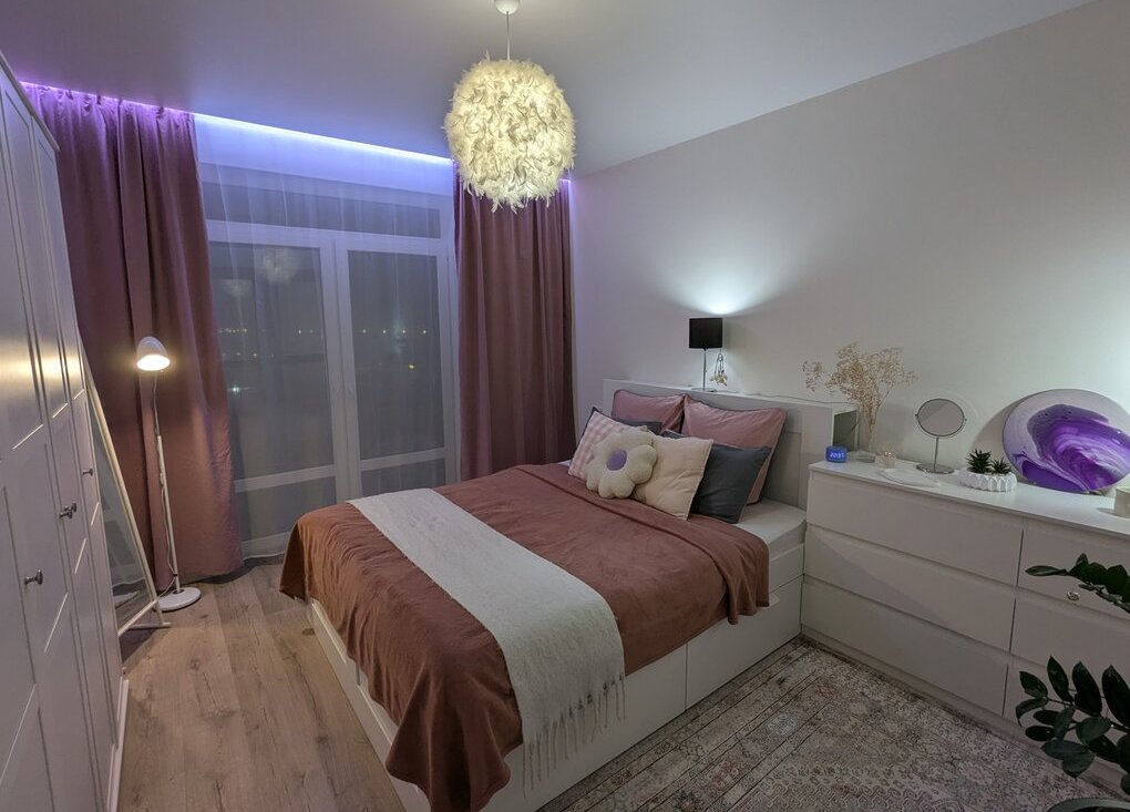 - В спальне сделано полностью панорамное окно в пол для потрясающих видов (убрано окно от застройщика с маленьким подоконником и установлено с открывающимися двумя створками, в пол, более широкое), сняты все ненужные решетки, чтобы не мешали лицезреть красоту, на балконе сделана летняя зона релакса, если утеплить балкон, можно и зимой сидеть и наслаждаться видами
