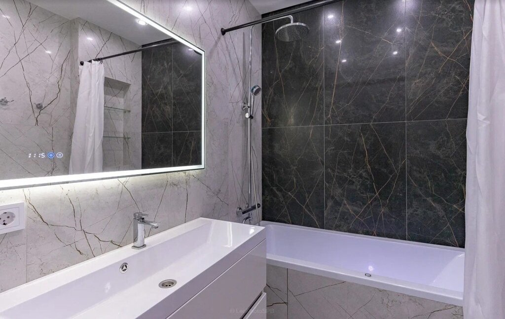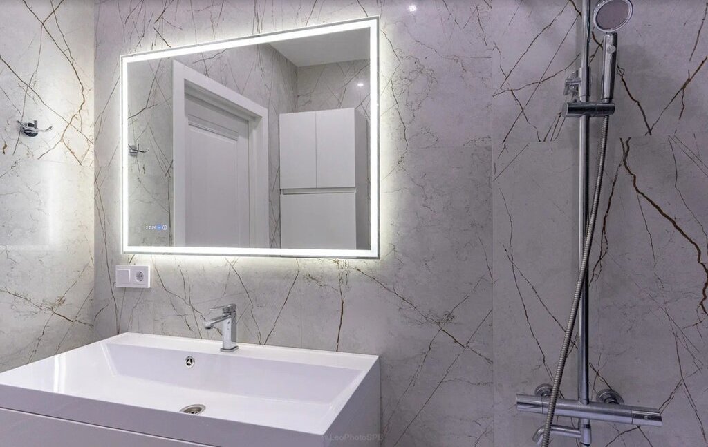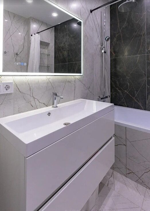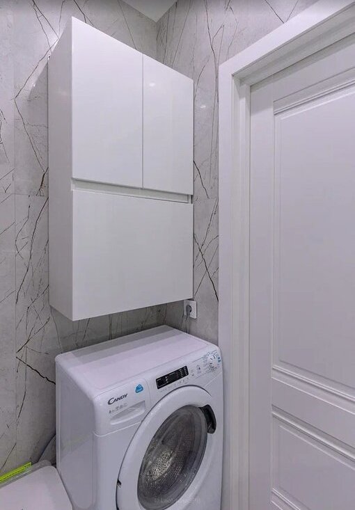 - Зеркало с подсветкой и подогревом от запотевания, часами. Тумба с раковиной из искусственного камня (не обычный фаянс). В шкафчике, что висит над стиральной машиной нижнее отделение является корзиной для белья, не нужно ставить какие-то дополнительные корзины.
