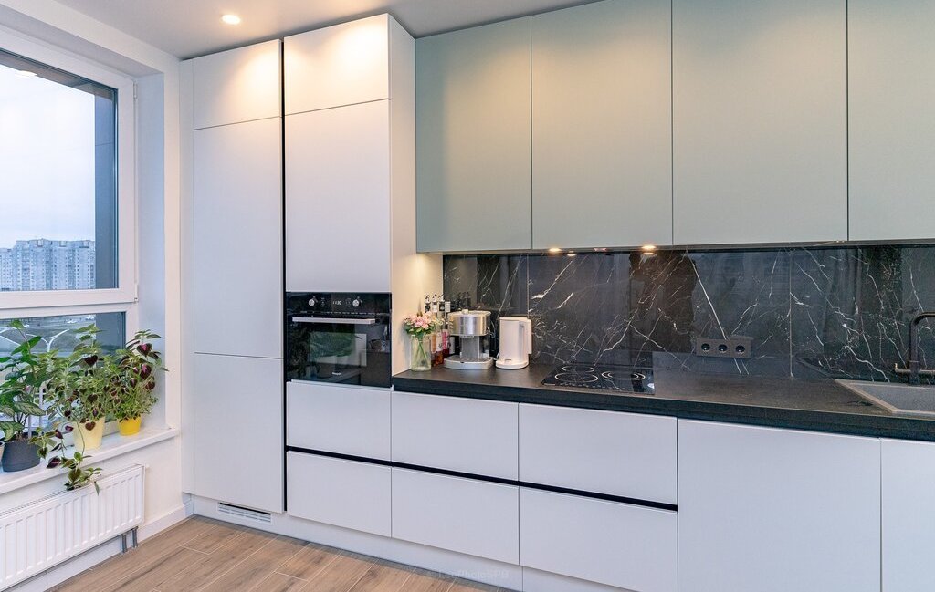 - Дорогой мебельный гарнитур на кухне: встроенный холодильник, микроволновка-духовка, посудомойка, измельчитель бытовых отходов, кран с двойной подачей воды (включая фильтр тонкой очистки, питьевой)