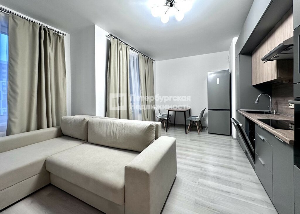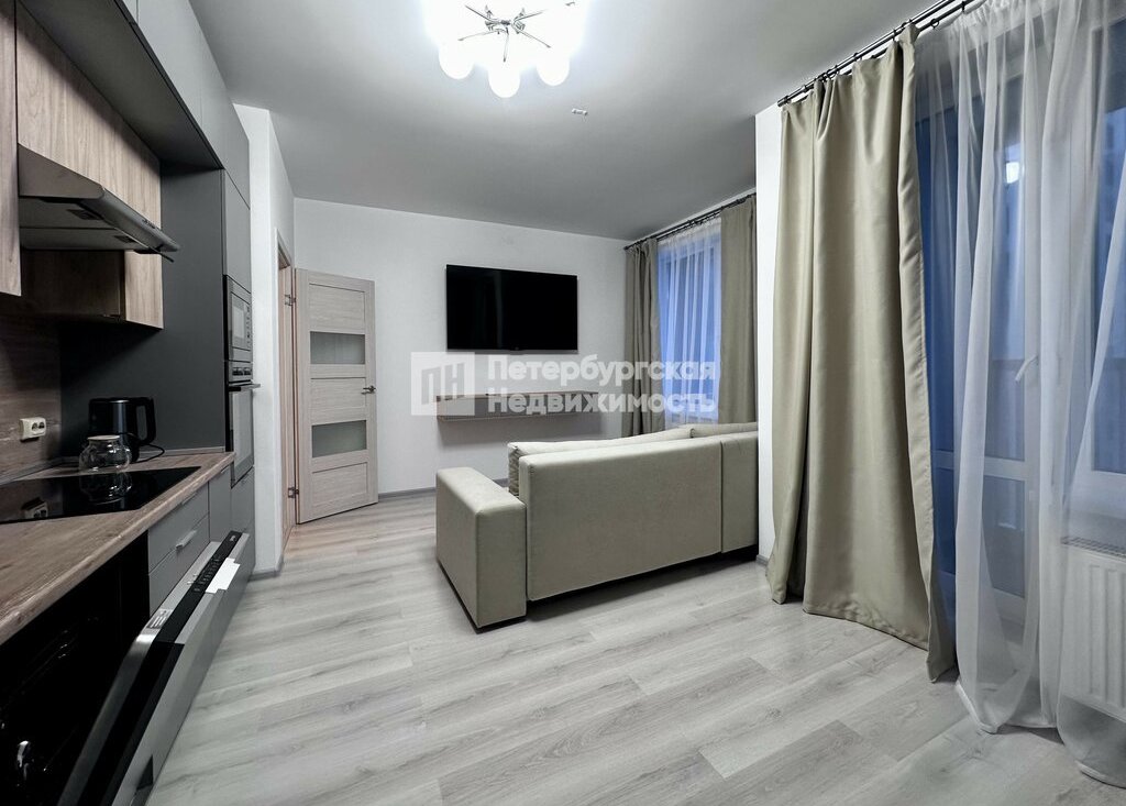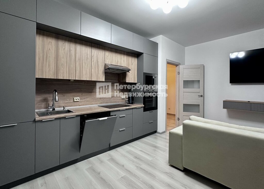 - Просторная кухня-гостиная (20,4 м2): идеальное место для отдыха и приема гостей. Вместительный кухонный гарнитур оборудован всей необходимой встроенной техникой (духовой шкаф, варочная панель, вытяжка, посудомоечная машина и микроволновая печь), холодильник. Есть обеденный стол и ТВ-зона с удобным диваном и телевизором.