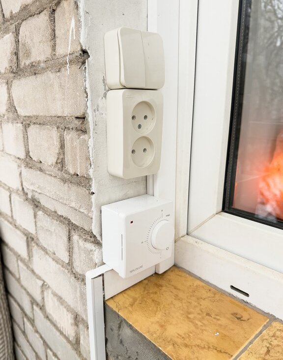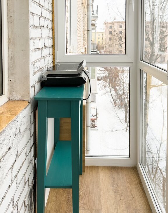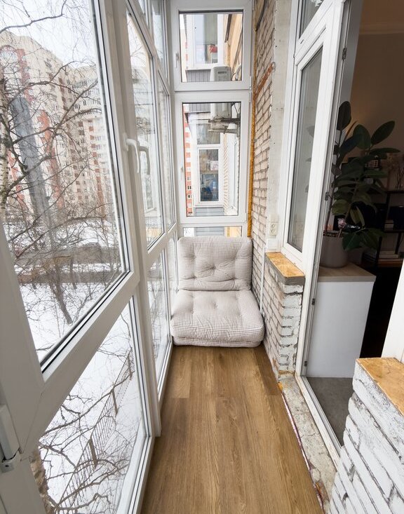 На балконе выполнен ремонт, сделано панорамное остекление, теплый пол и освещение.