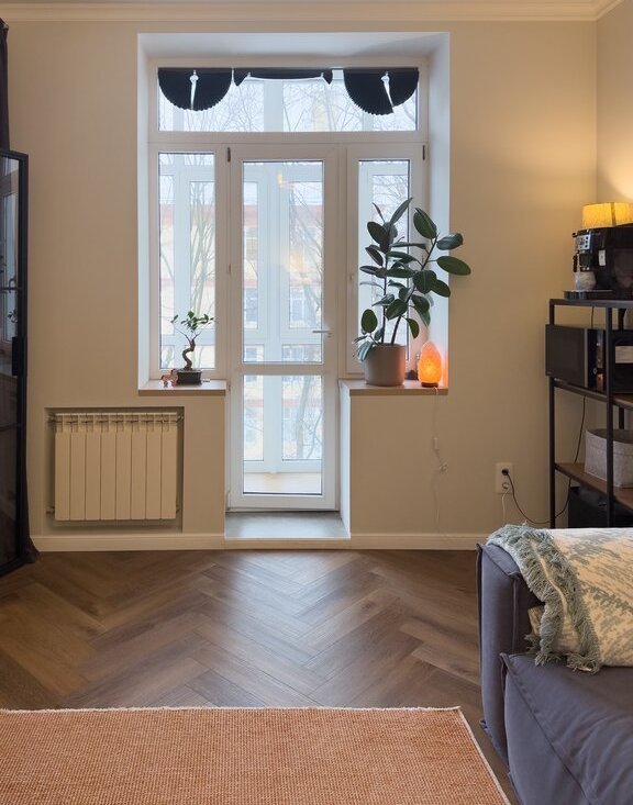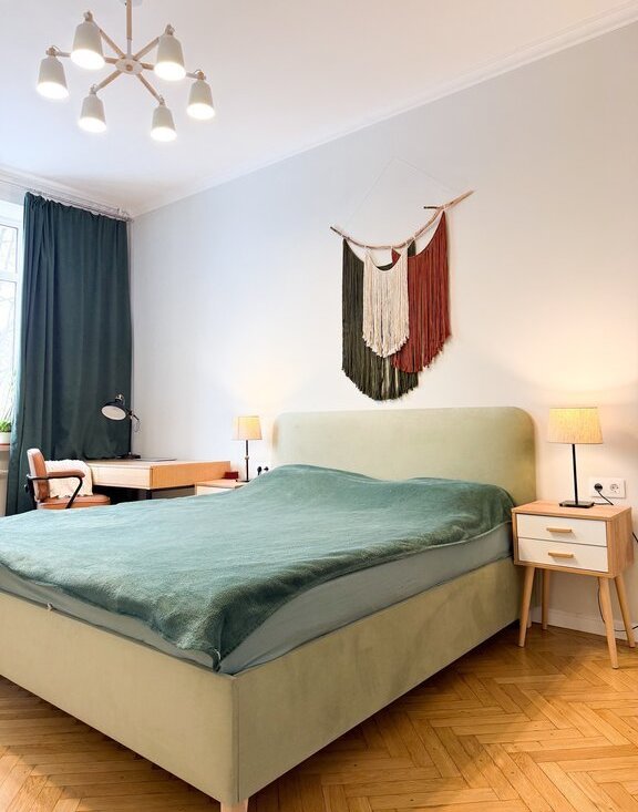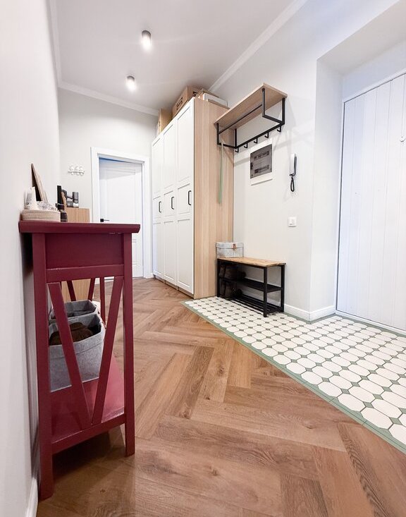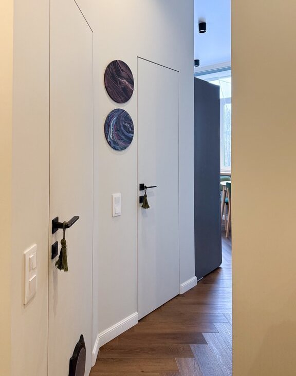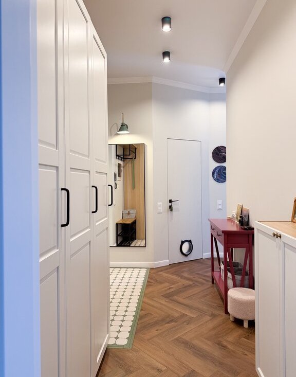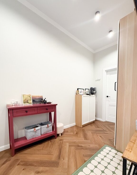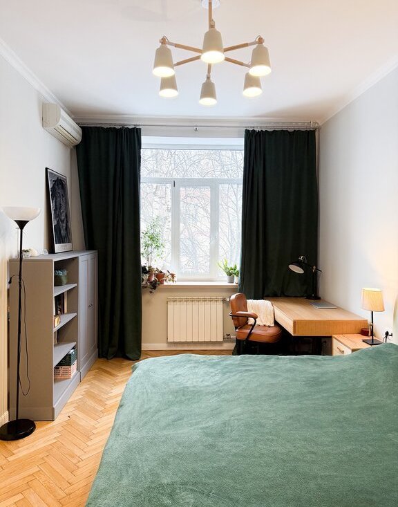Стены оформлены под покраску, на полу надежное и прочное покрытие из кварцвинила. В спальне отреставрирован родной паркет из дуба.