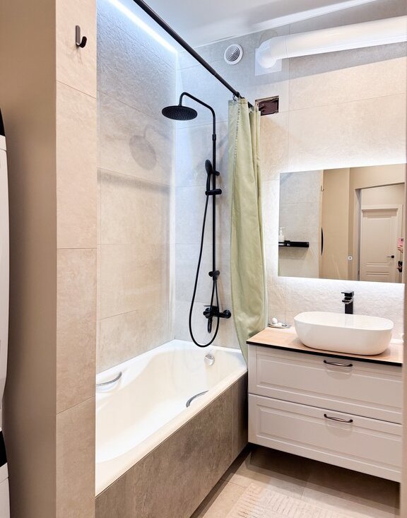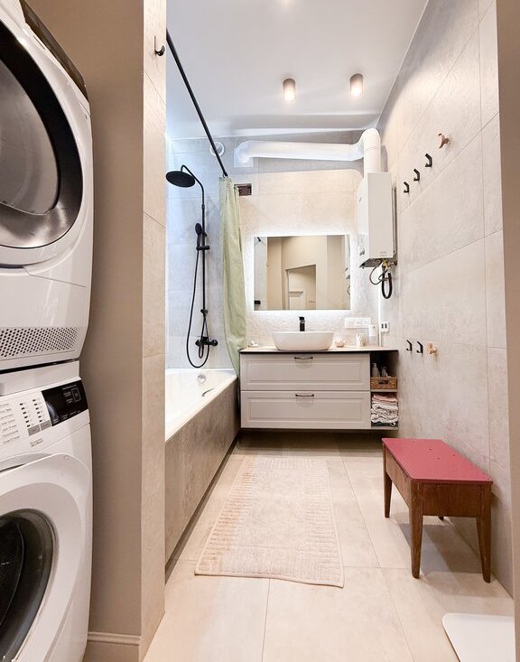 Квартира оснащена газовой колонкой Bosch, что обеспечивает бесперебойную подачу горячей воды.