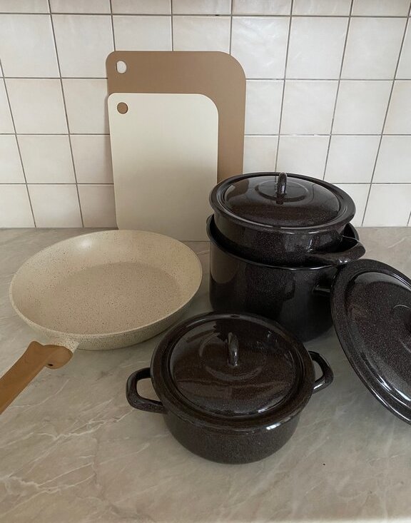 - столовая посуда и кухонная утварь (новая сковорода и кастрюля).