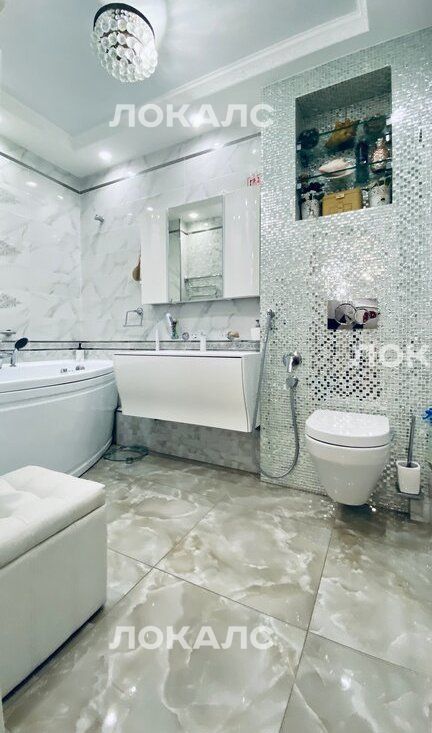Санузел совмещенный, оформлен стильной плиткой, оснащён ванной с аэромассажем и хромотерапией. Стиральная машина Воsсh Sеriе 6. Инсталляция, унитаз, гиг. душ-немецкие AM.PM .Раковина из искусственного мрамора с тумбой фурнитуры Вlum. Шкаф зеркальный с регулируемой подсветкой и розеткой.