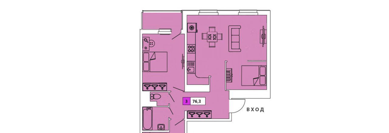 2-е просторные раздельные детские комнаты, взрослая спальная комната, кухня-гостиная, раздельный санузел, просторная прихожая, гардеробная, застеклённая лоджия