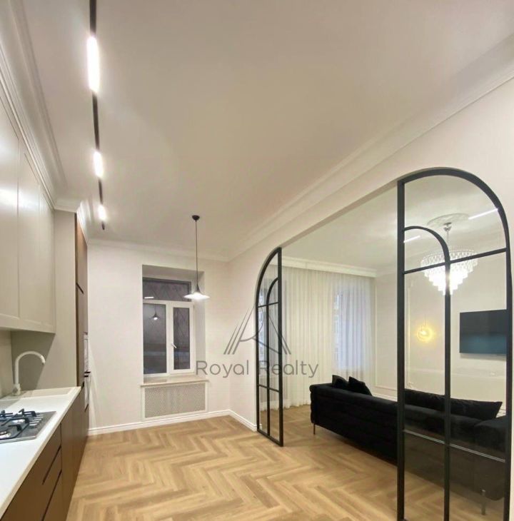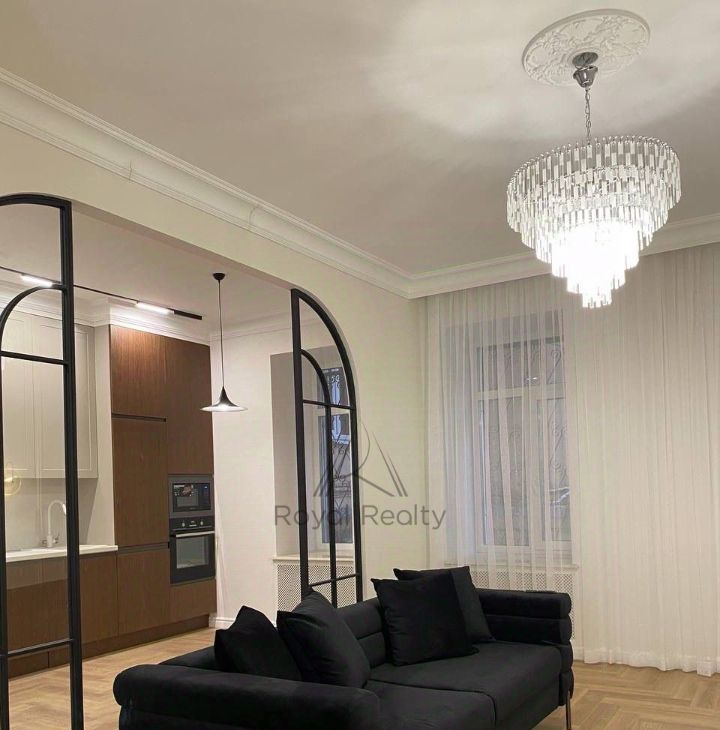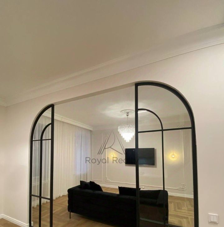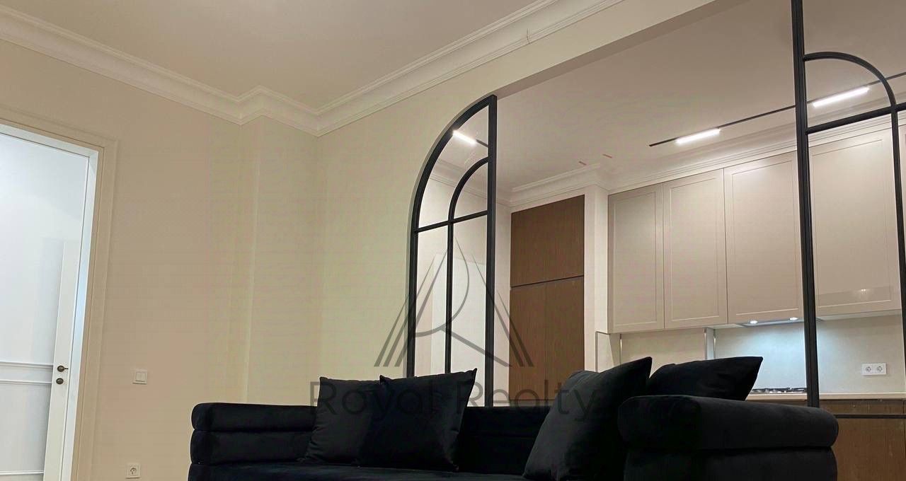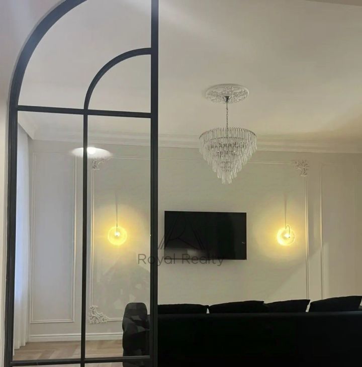 Просторная кухня-гостиная: Сердце квартиры. Зона готовки визуально отделена от зоны отдыха эффектными черными арочными перегородками со стеклом. Кухня полностью укомплектована встроенной техникой (духовой шкаф, микроволновая печь, варочная панель). Зона отдыха оснащена глубоким черным бархатным диваном и большой ТВ-зоной.