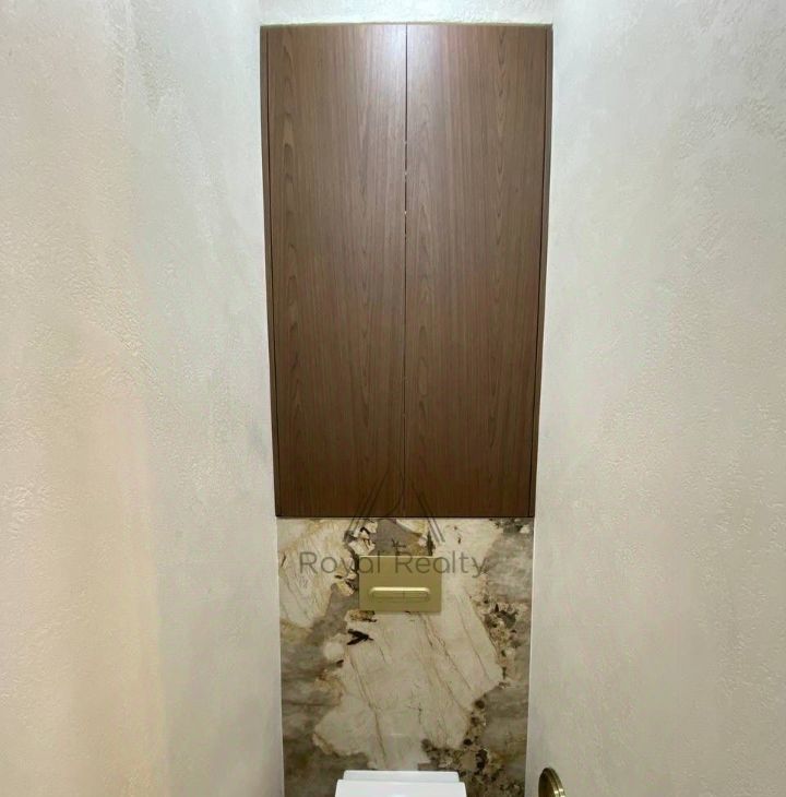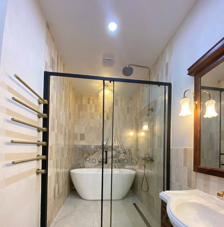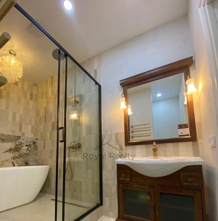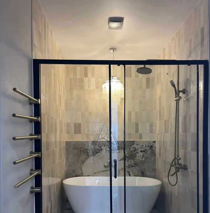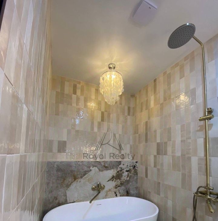 Роскошный санузел: Настоящая SPA-зона. Отделка натуральным камнем/мрамором в бежевых тонах. Есть отдельно стоящая ванна, душевая зона с тропическим душем, дизайнерский полотенцесушитель и вместительная тумба из дерева.