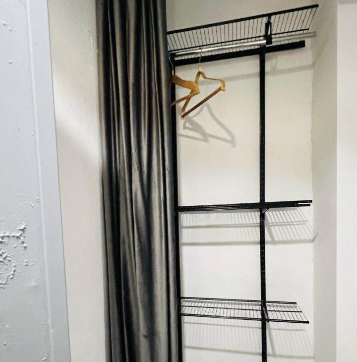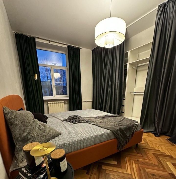 В квартире много мест хранения (5 метров шкафов в спальне, 3,5 - в коридоре), большой раскладной диван в гостиной, в спальне кровать