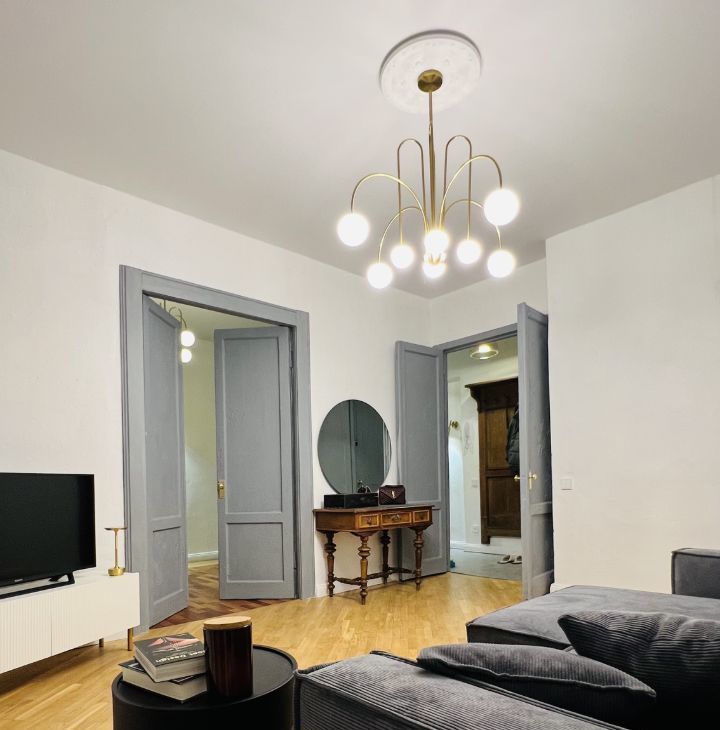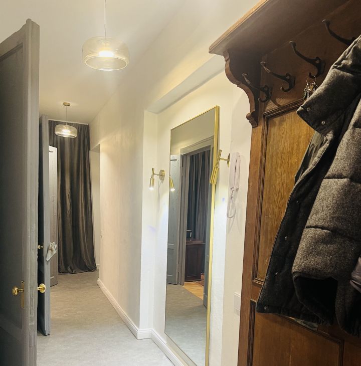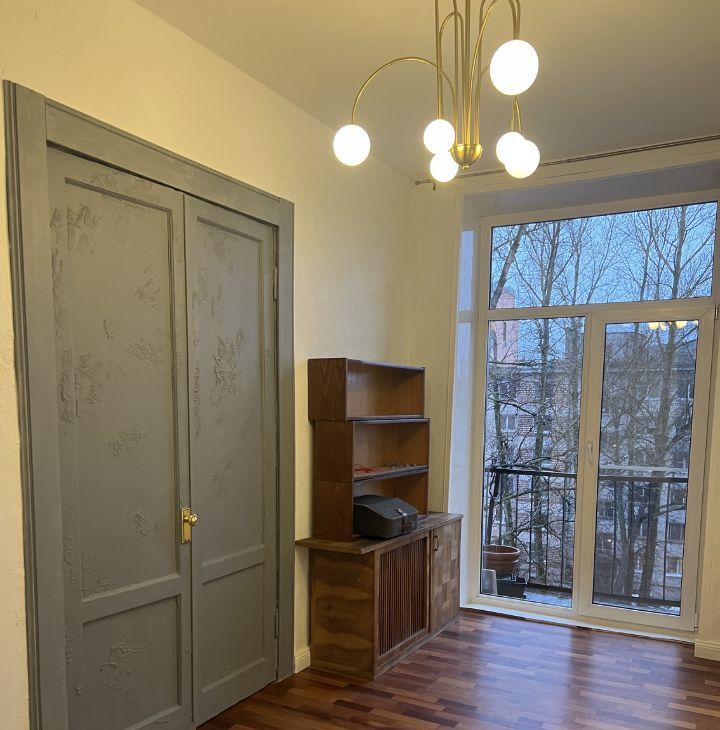 Окна выходят на две стороны - в зеленый двор и на улицу с красивыми старинными фасадами, в одной из комнат балкон с панорамным окном в пол.