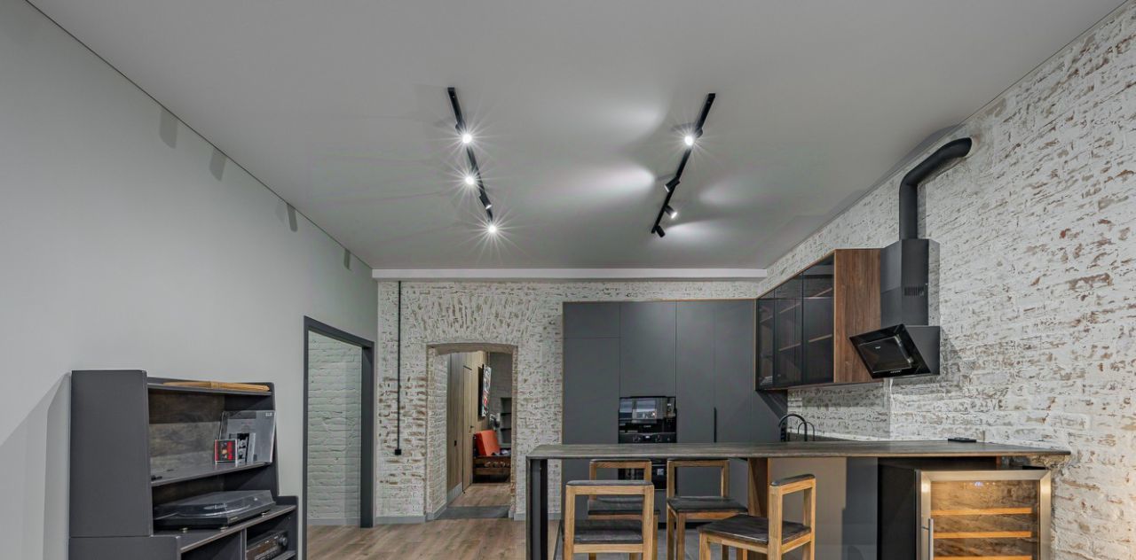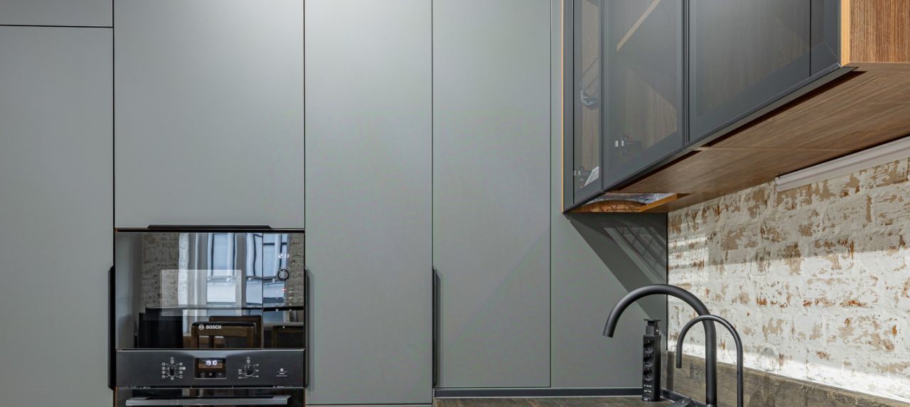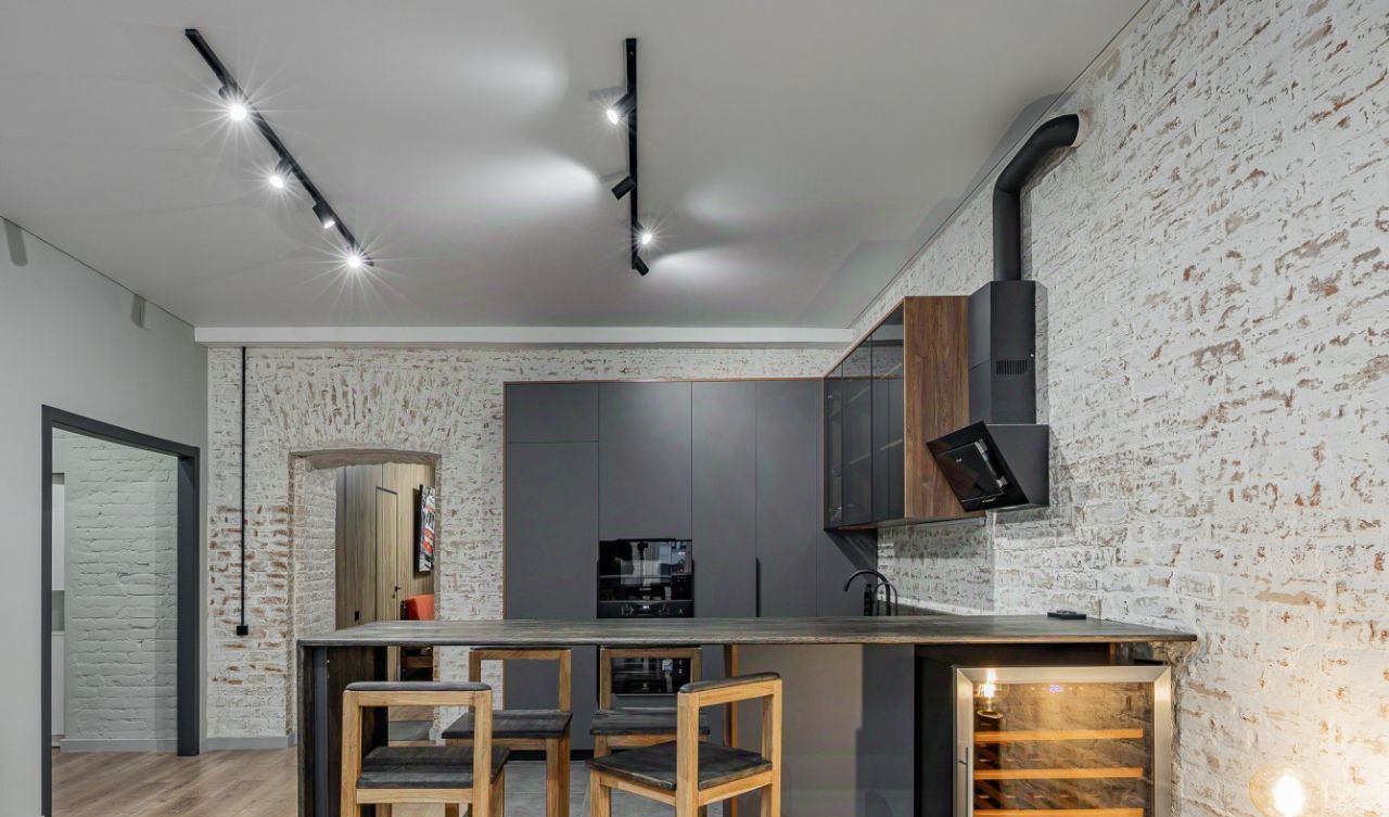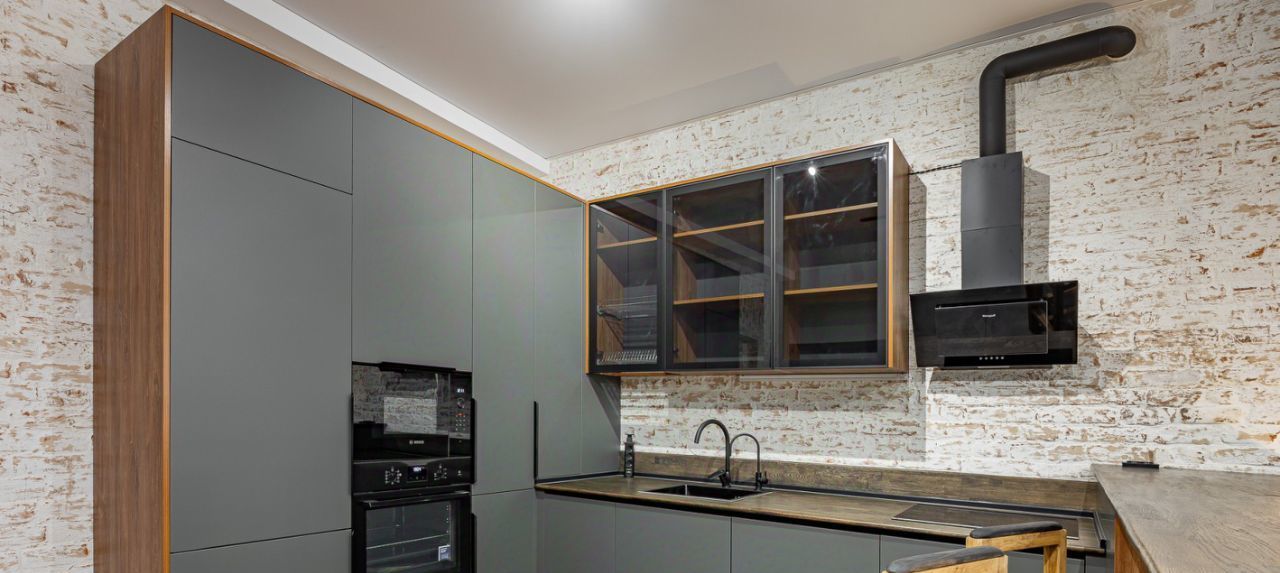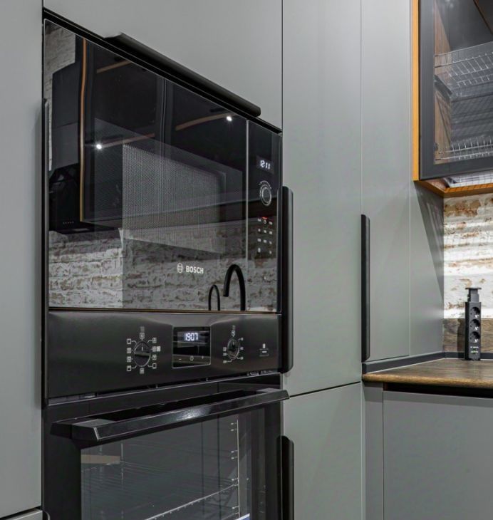 Встроенная кухня оборудована множеством мест хранения и бытовой техникой, есть даже винный шкаф. Установлены стиральная и сушильные машины.