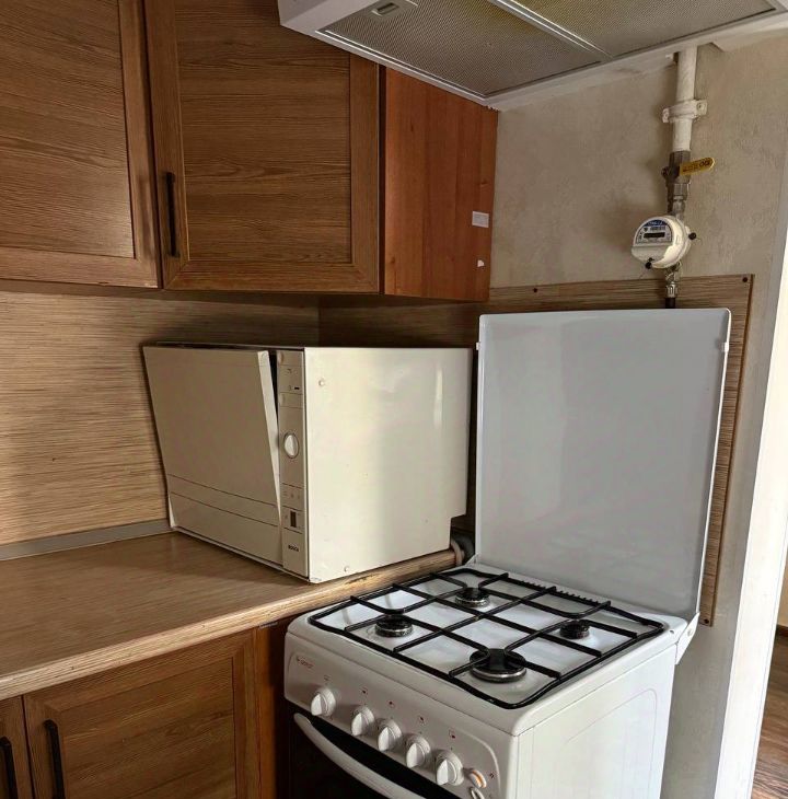 На кухне: настольная посудомойка, газовая плита, духовка, холодильник.