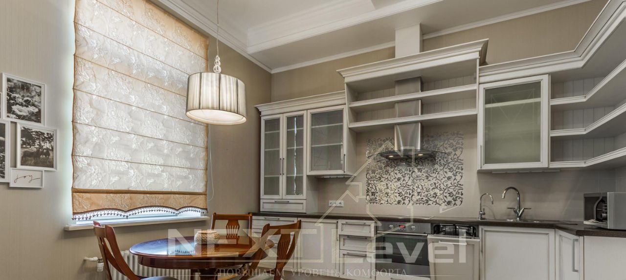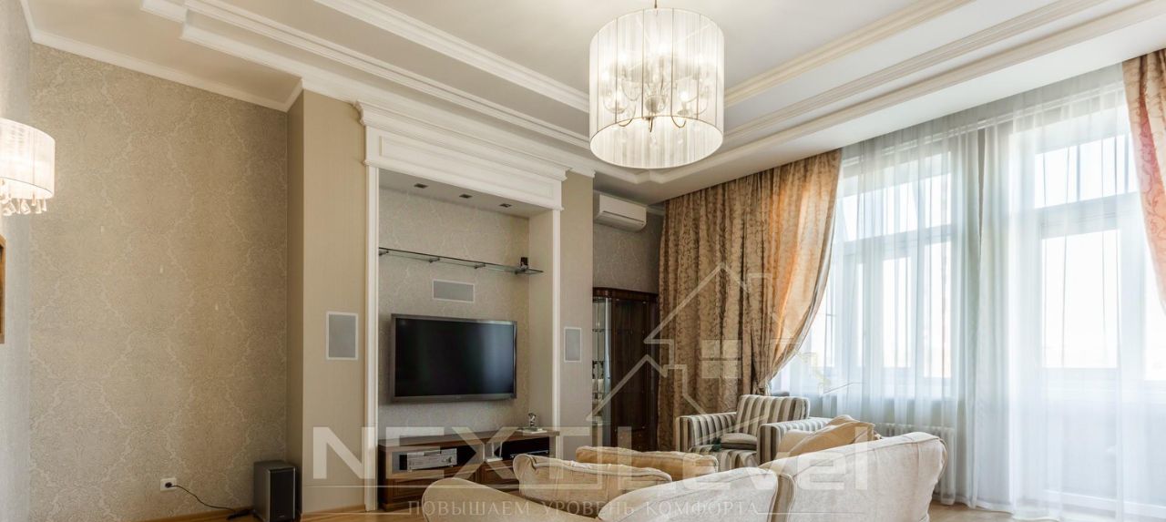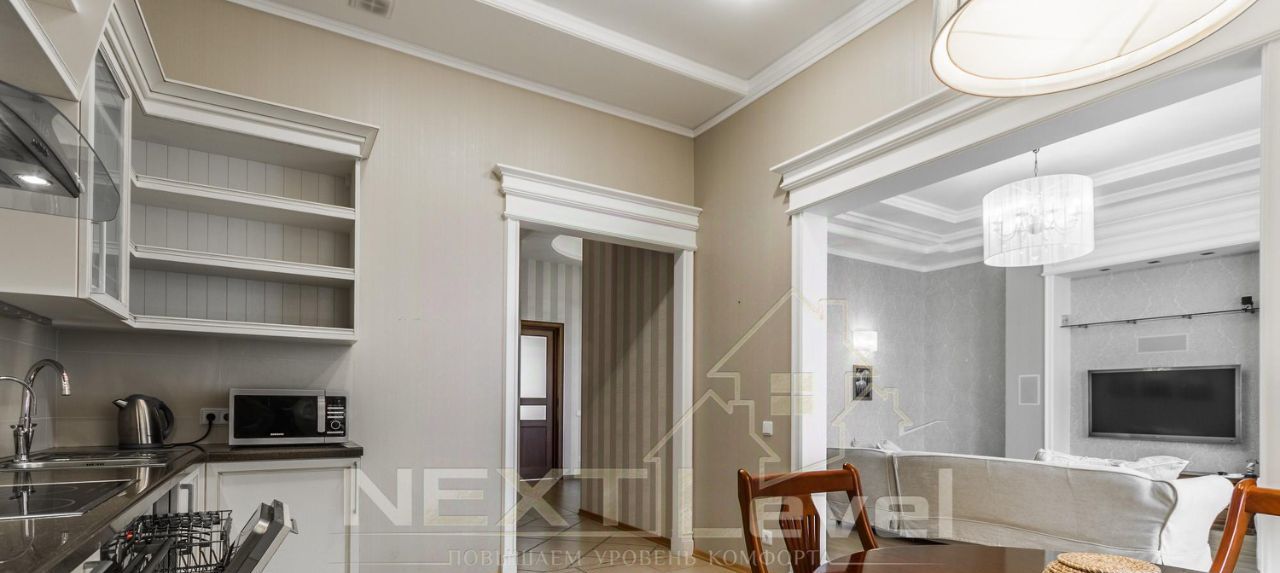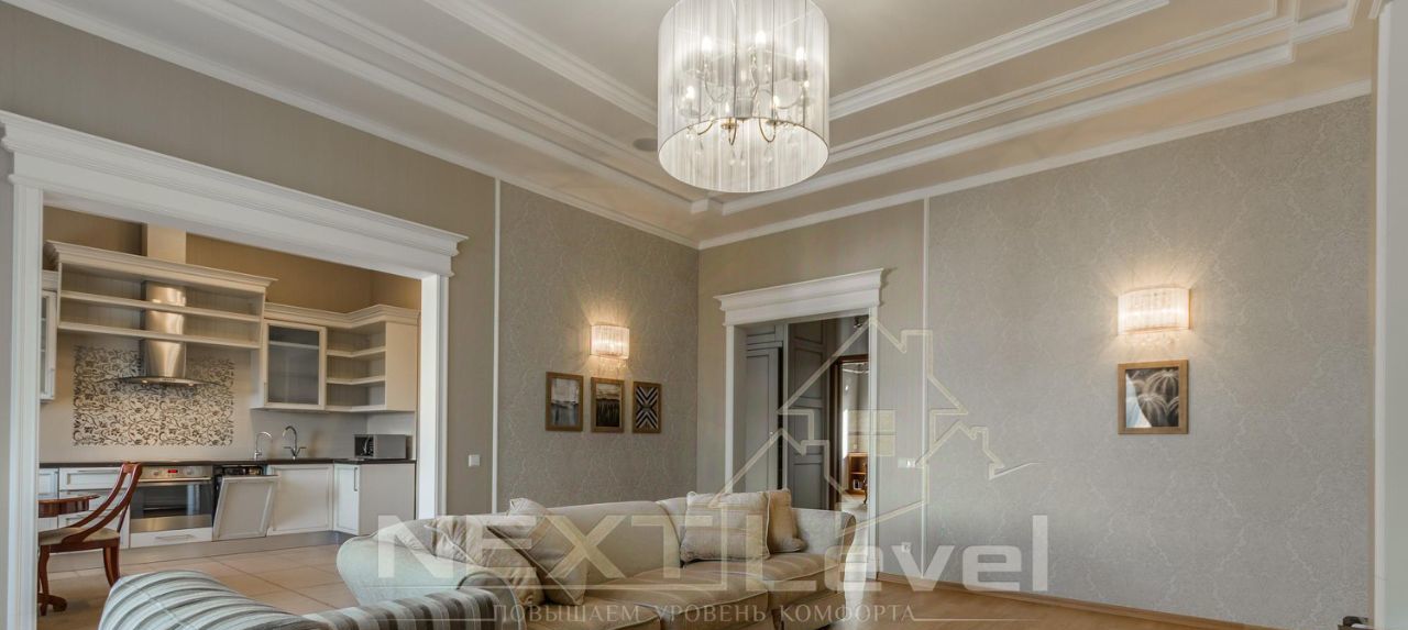 Квартира общей площадью 130 кв..м.с высотой потолков 4 метра, в современном элитном жилом комплексе. Двусторонняя светлая квартира. Гостиная, кухня через арку, прихожая, две спальные комнаты (во второй есть уже кровать), два санузла.