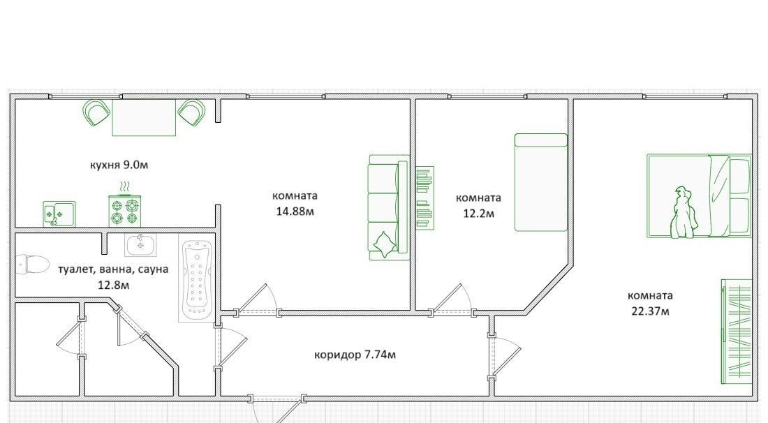 Кухня соединена с комнатой, образуя единое пространство. Две другие комнаты изолированные. В ванной комнате расположены баня-сауна с предбанником.