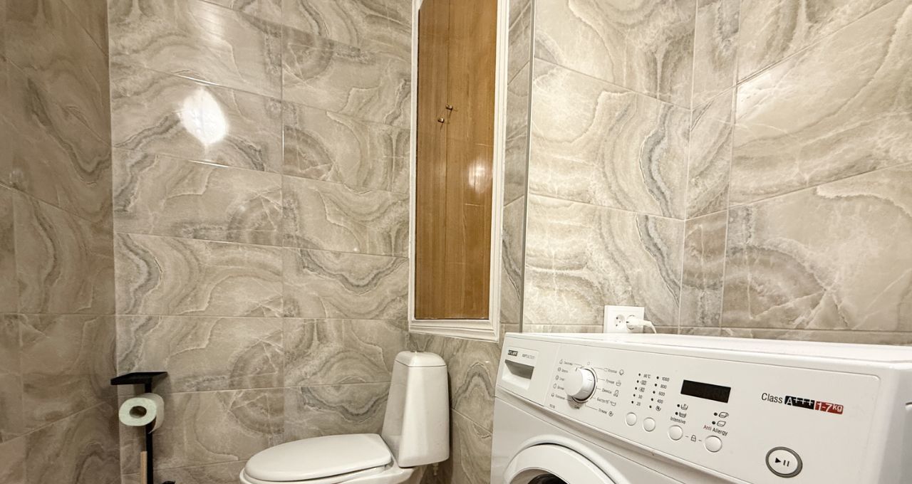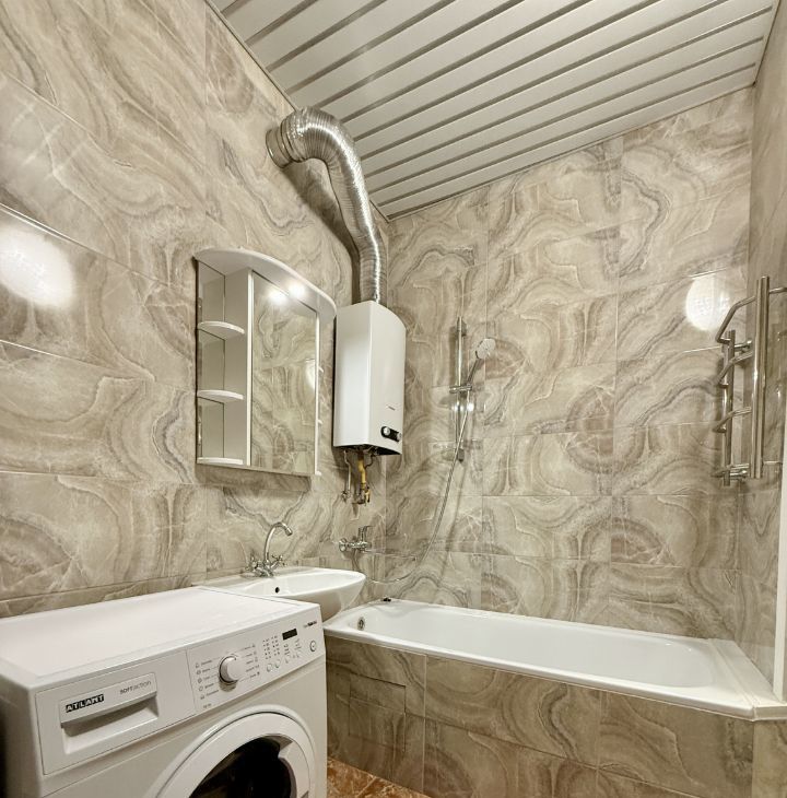 — просторный совмещений санузел ПОСЛЕ РЕМОНТА, НОВАЯ ВАННА, в кафеле; установлена — НОВАЯ современная газовая КОЛОНКА, благодаря чему всегда есть горячая вода; НОВАЯ стиральная машина-автомат