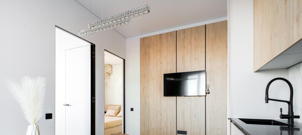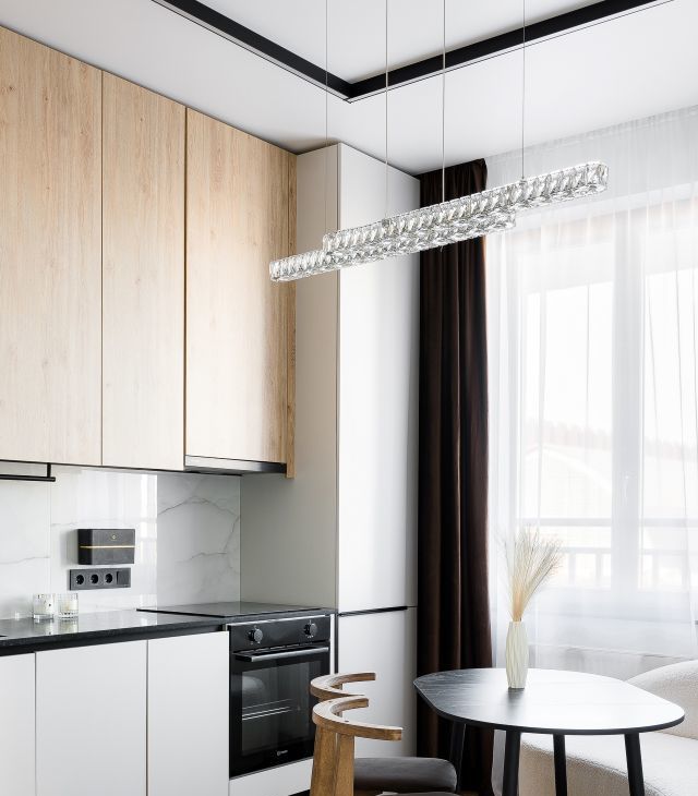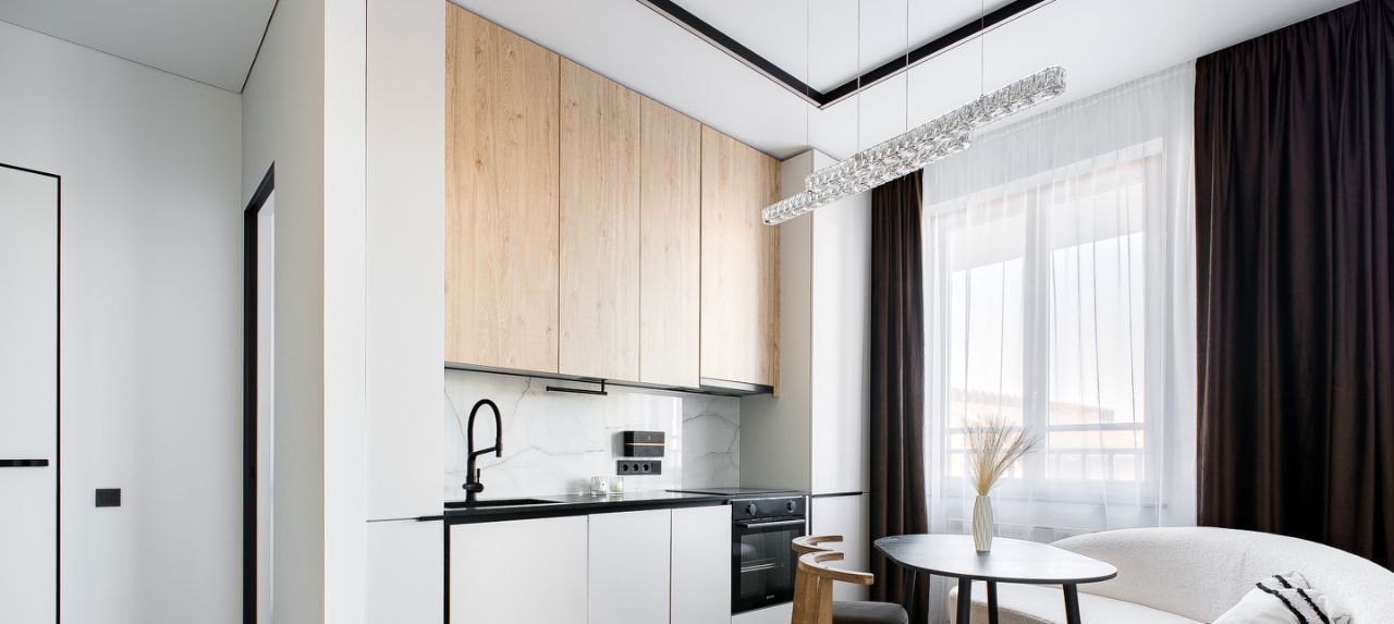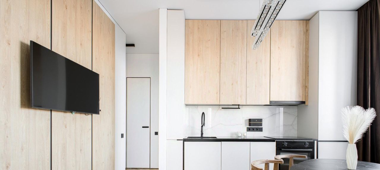 - кухня-гостиная с дизайнерским диваном и телевизором (фото 1, фото 7-14)
