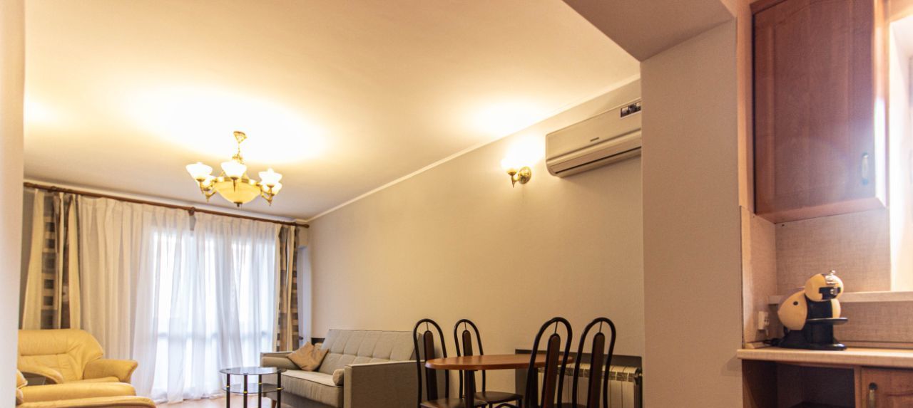 По планировке: две изолированные спальни и просторная кухня гостинная, два совмещенных санузла. Встроенная кухня с посудомоечной машиной, установлены кондиционеры. В квартире есть вся необходимая мебель и бытовая техника для комфортного проживания. Дом кирпичный.