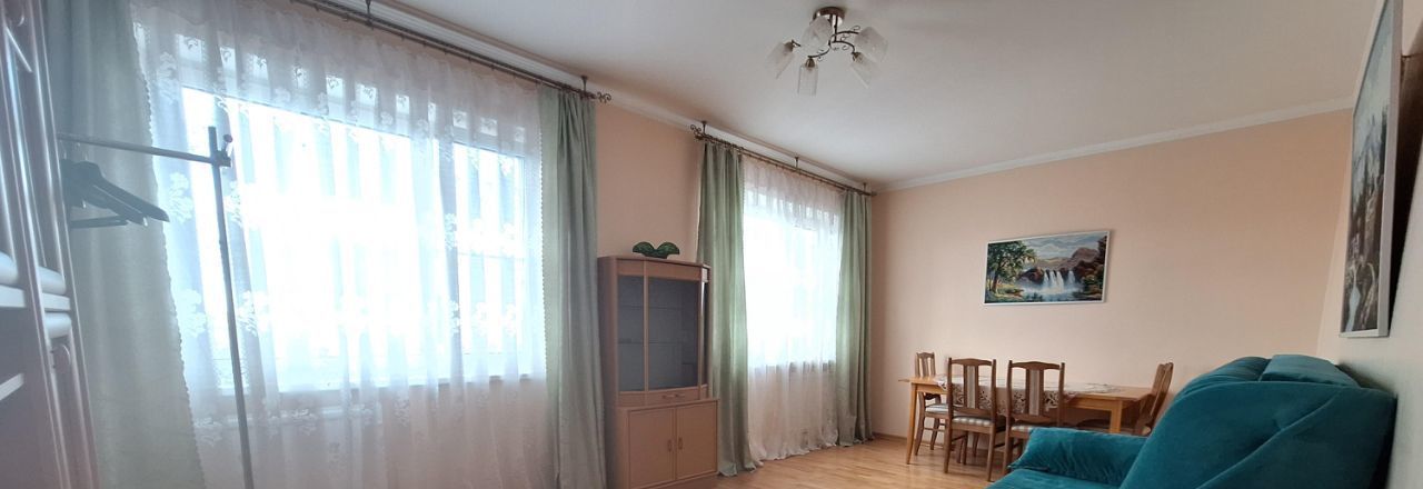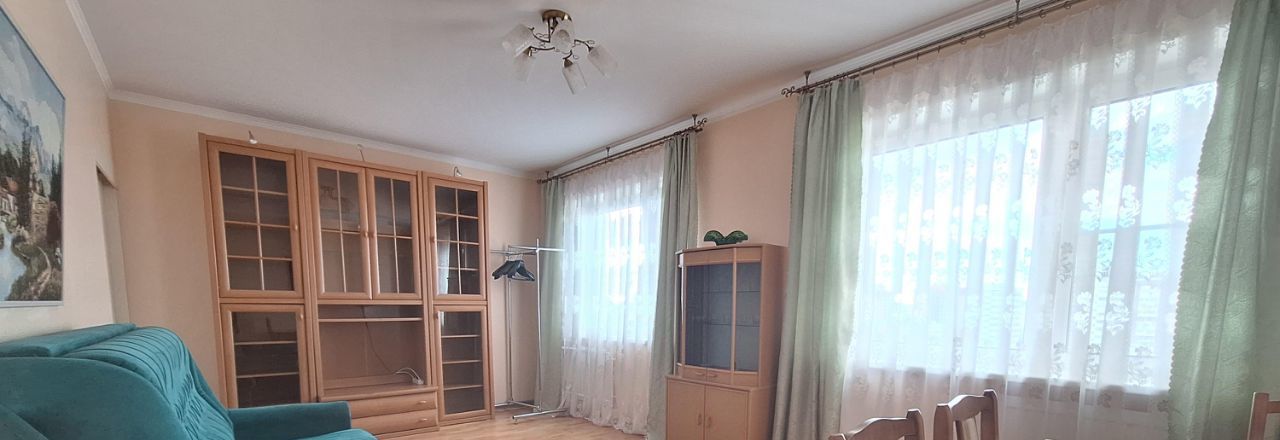 В гостиной удобный раскладной диван с пружинным блоком 160х200 и отделением для хранения, большой буковый развдигающийся стол, шкаф и буфет с подсветкой.