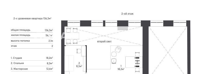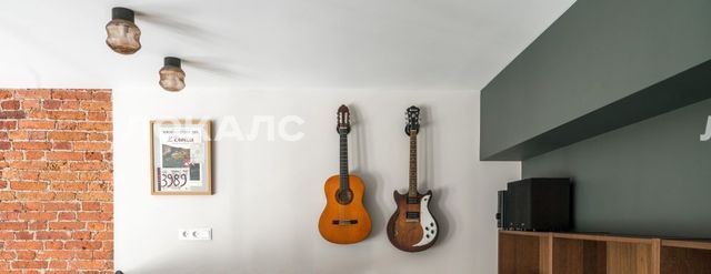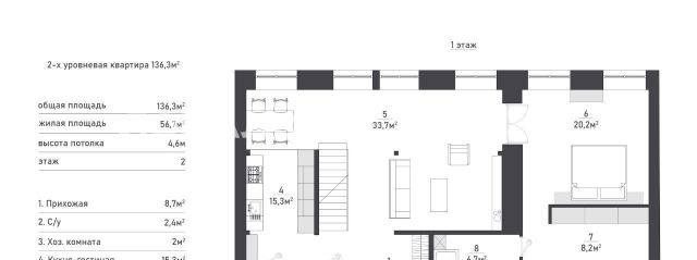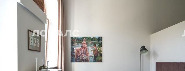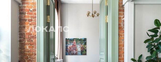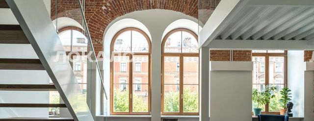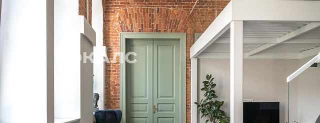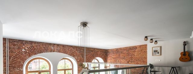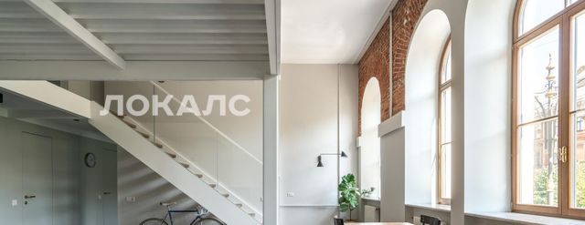 В квартире много света, благодаря большим окнам, высоты которых хватает на оба уровня. Ремонт в квартире выполнен в минималистичном стиле, с сохранением исторических элементов.