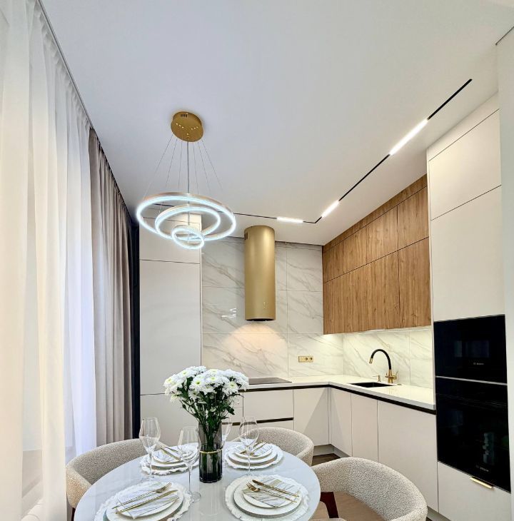 Полностью обставленная кухня. Столешница из акрилового камня, каменный обеденный стол, крупноформатный керамогранит на фартуке, удобные стулья-кресла из натурального бука.
